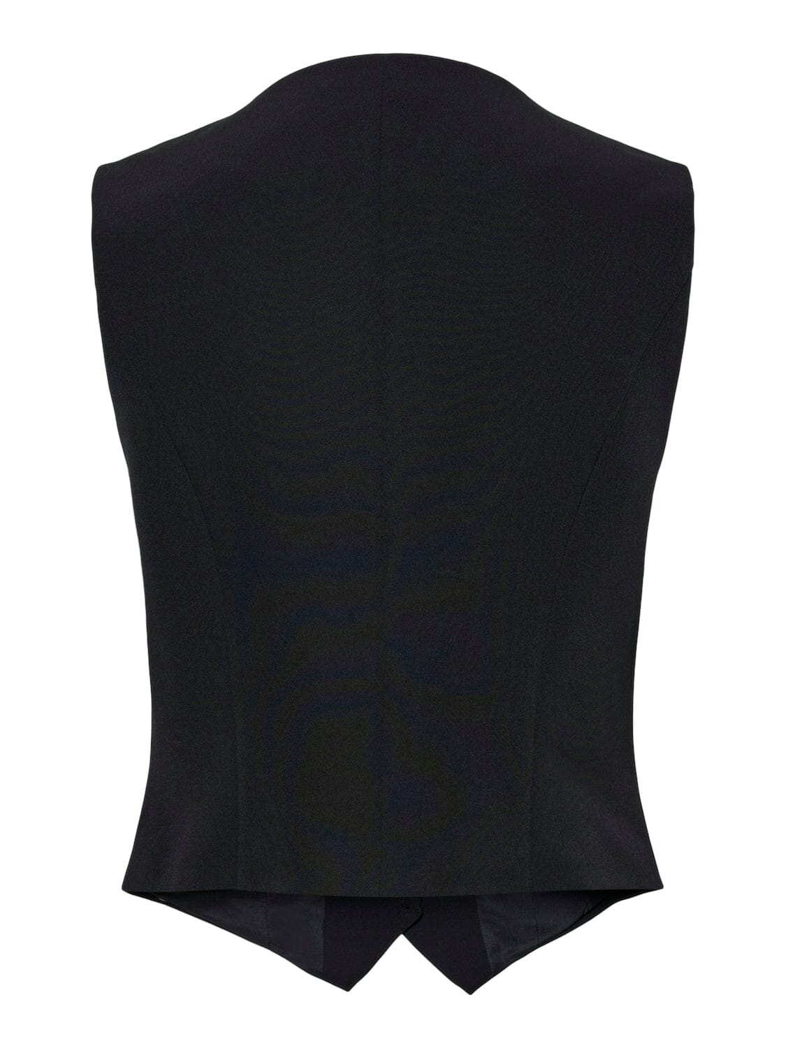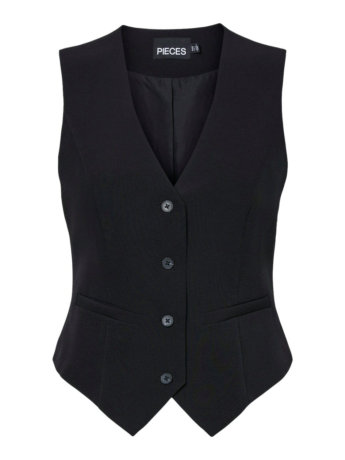 Zwarte vest van Pieces met V-hals en knoopsluiting aan de voorkant. Het heeft nepzakken en is gemaakt van een zachte, zijdeachtige polyesterelastanmix die goede bewegingsvrijheid biedt.