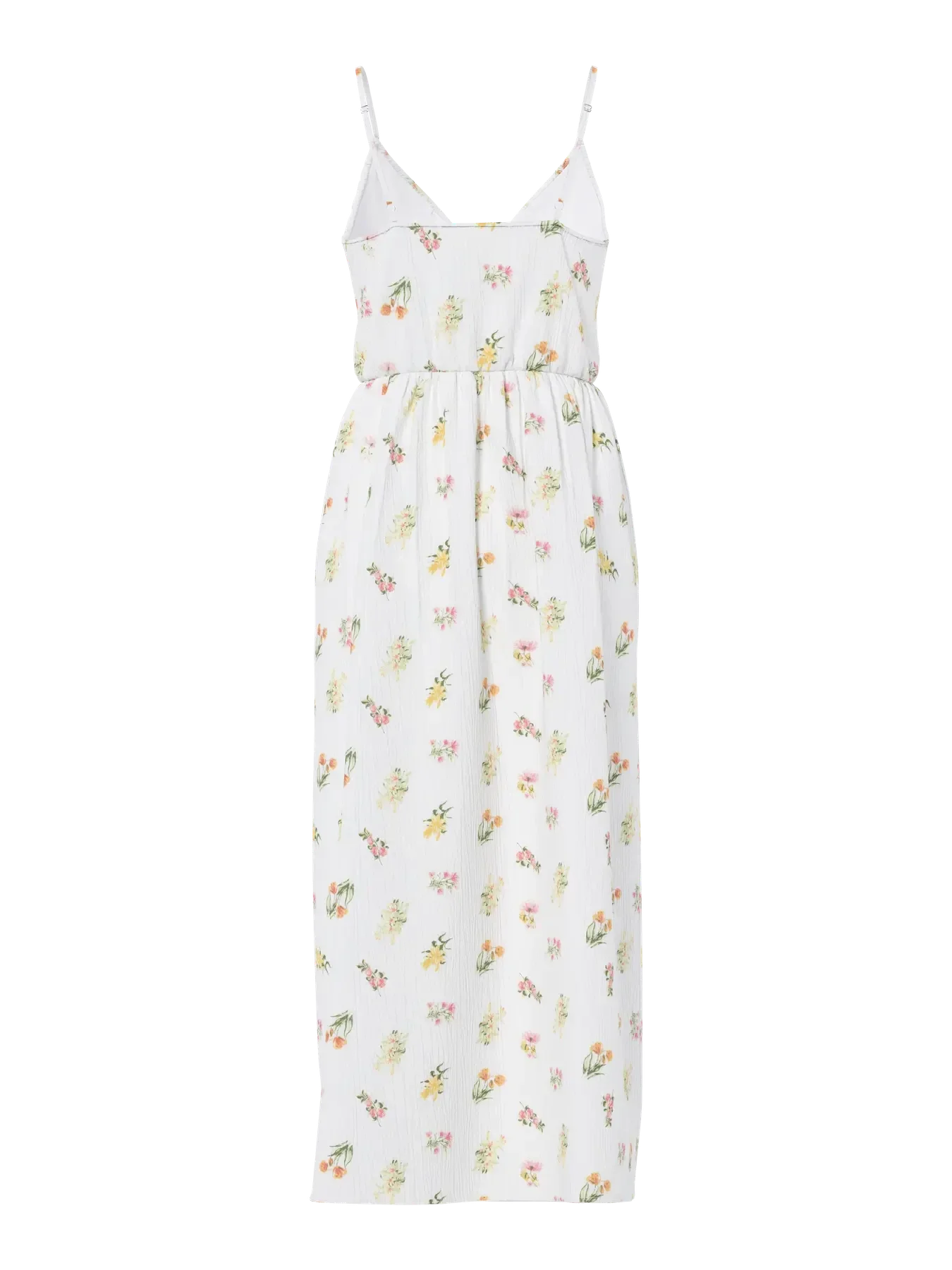 Witte jurk van Pieces met bloemenprint in lichte kleuren. Gemaakt van 100% biologisch katoen met dunne bandjes en enkellengte.