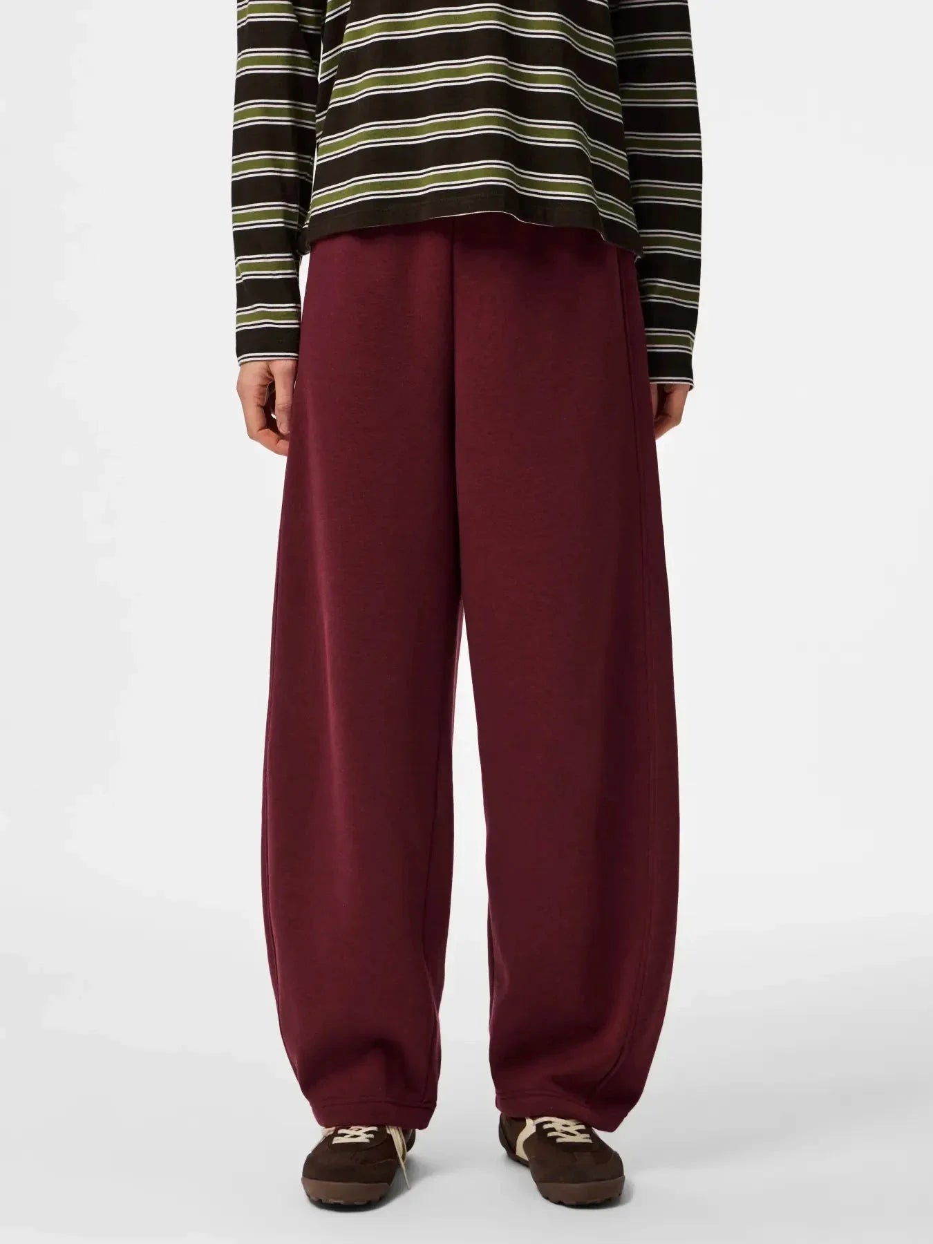 Barrel-broek van Pieces in een diep roodbruine kleur. De broek heeft een losse pasvorm met een wijd pijpontwerp en een elastische tailleband.