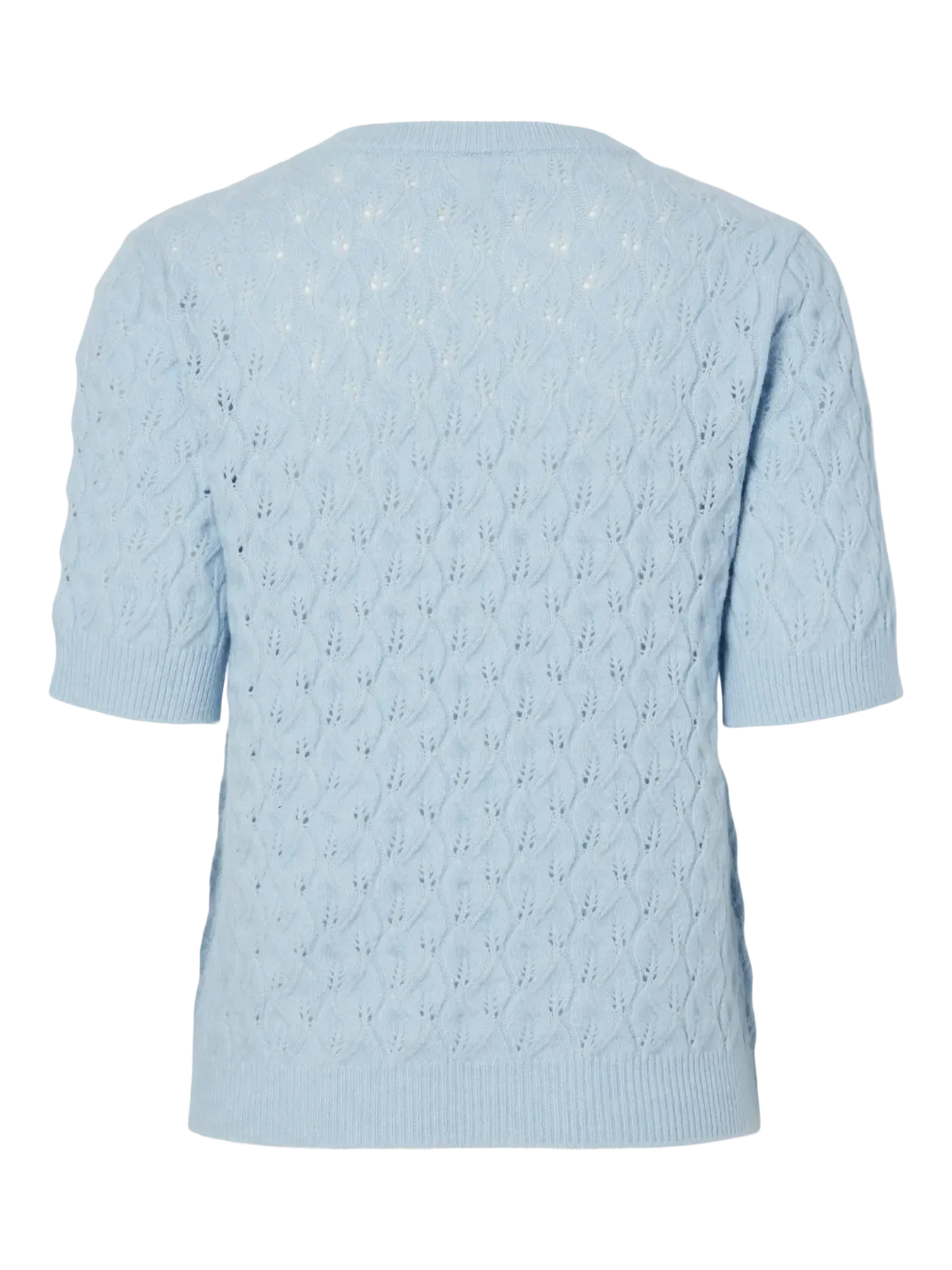 Een gebreide trui van Pieces in een lichtblauwe melangekleur. De trui heeft korte mouwen, een ronde hals en decoratieve stiksels in een bladmuster.
