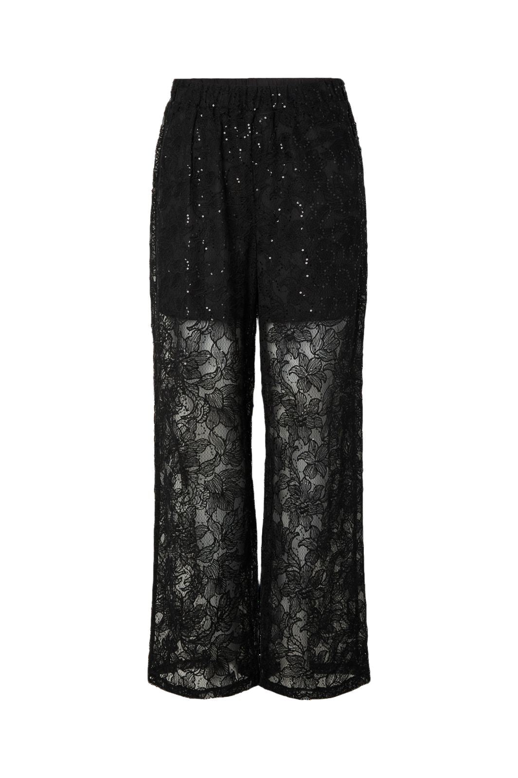 Zwarte broek van Pieces met pailletten op het bovendeel en een transparante kanten overlay vanaf de dijen naar beneden.