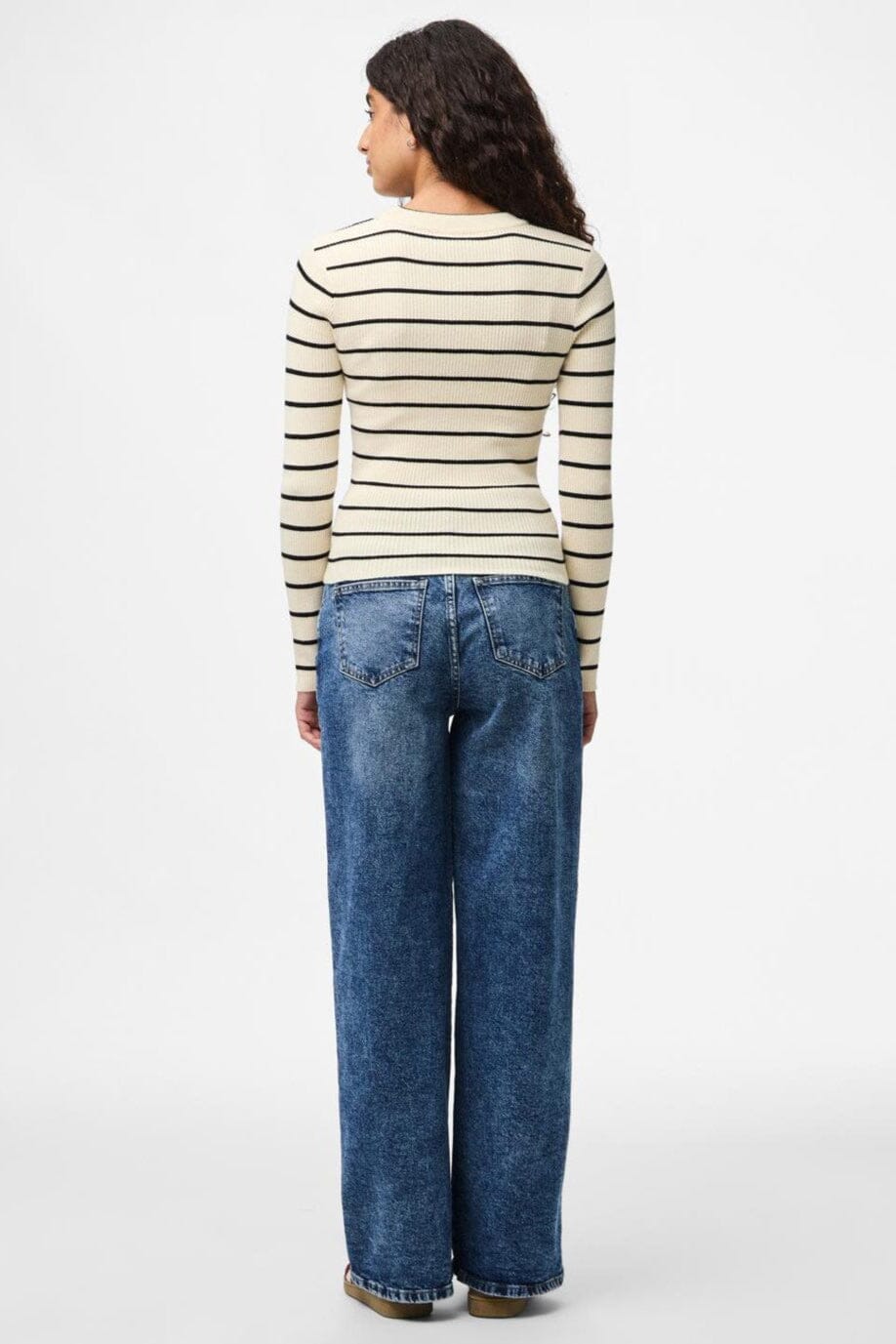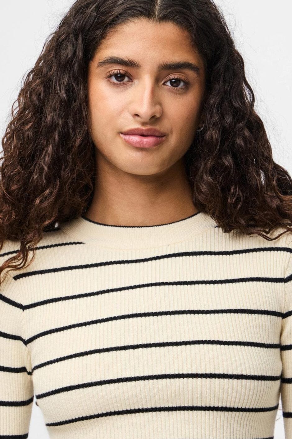 Gestreepte trui van Pieces met ronde hals. De lichte berkentint heeft smalle zwarte strepen en de trui heeft een aansluitende pasvorm met een geribbelde textuur.