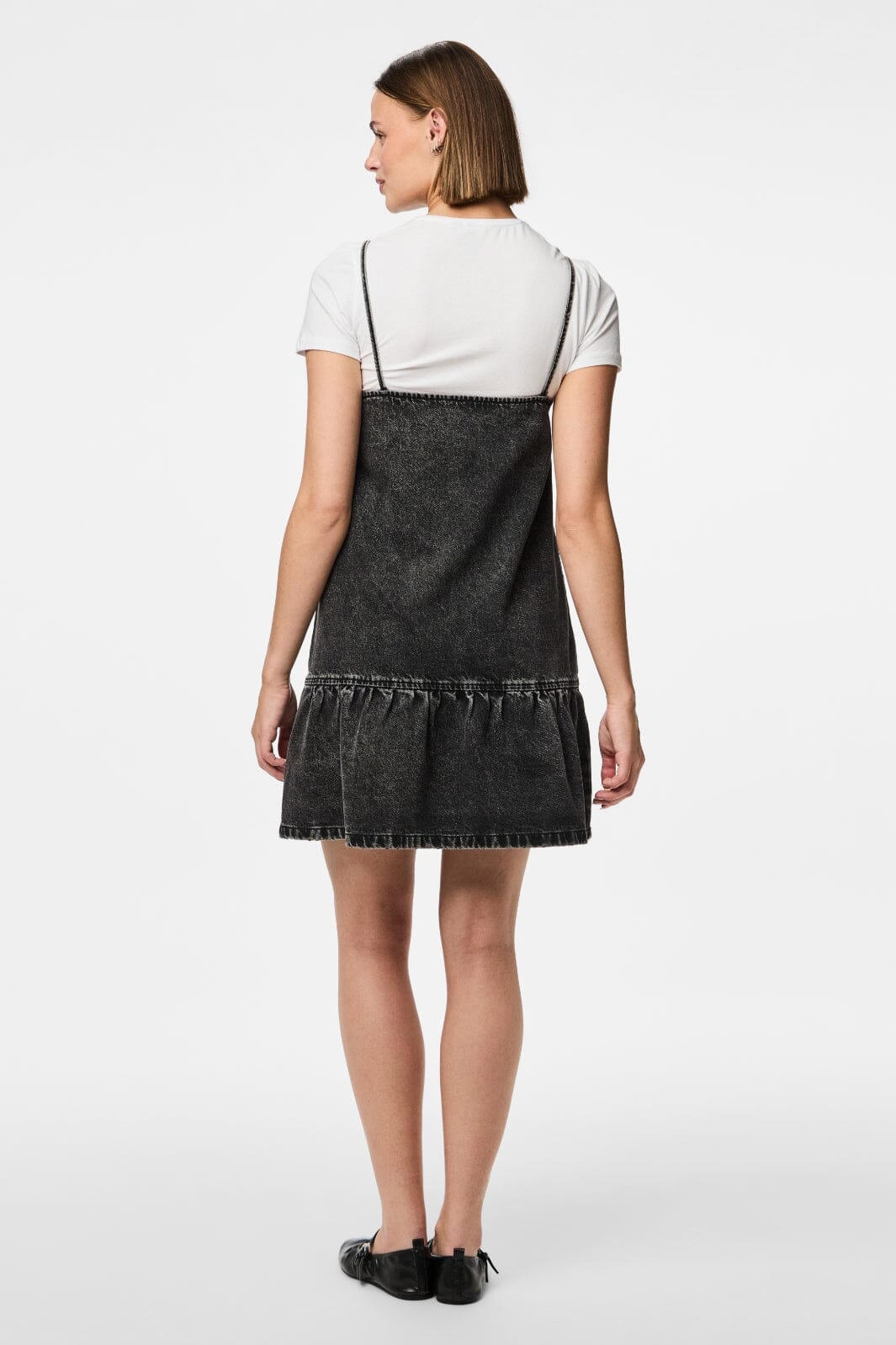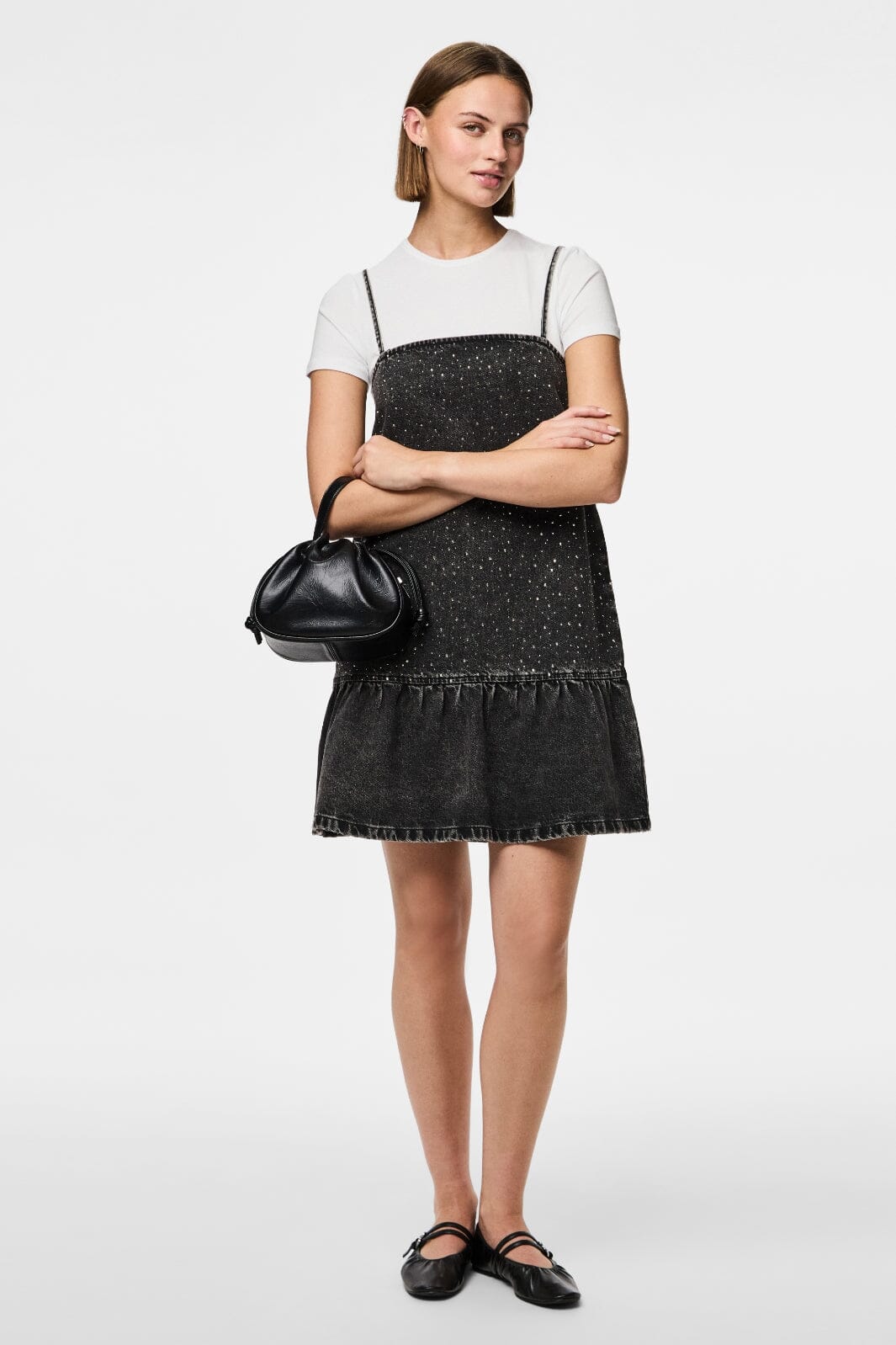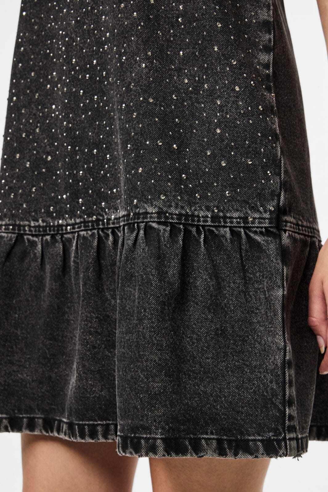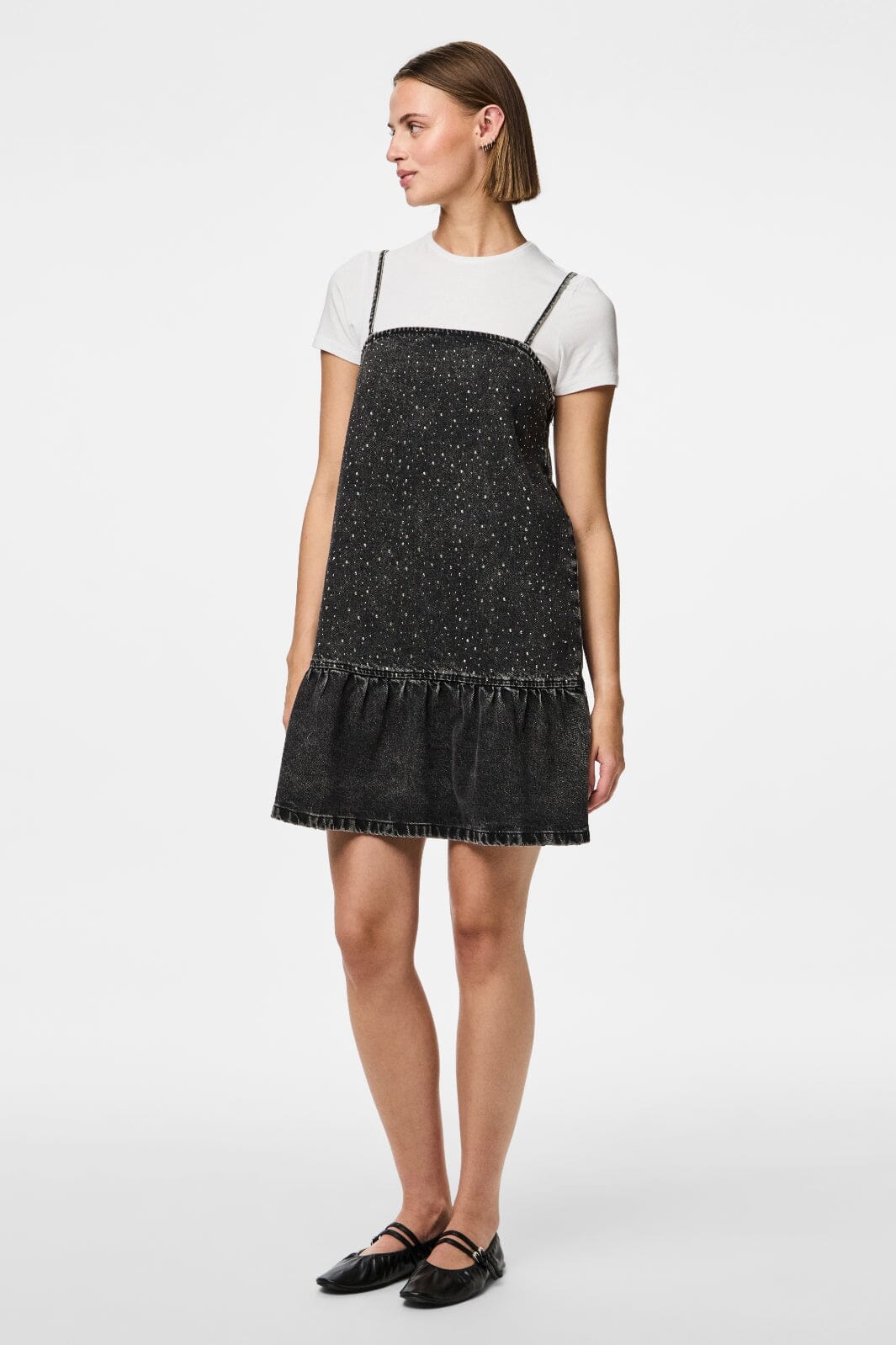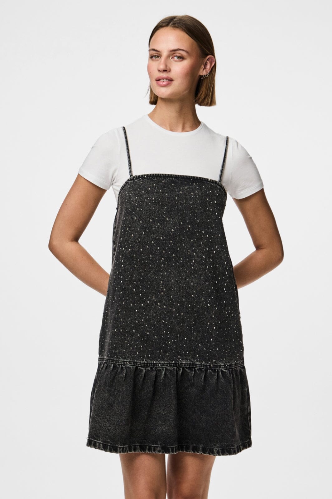 Zwarte denimjurk van Pieces met stonewash-behandeling. De jurk heeft een gerimpelde rand onderaan en rhinestones aan de voorkant die een versierd accent geven.