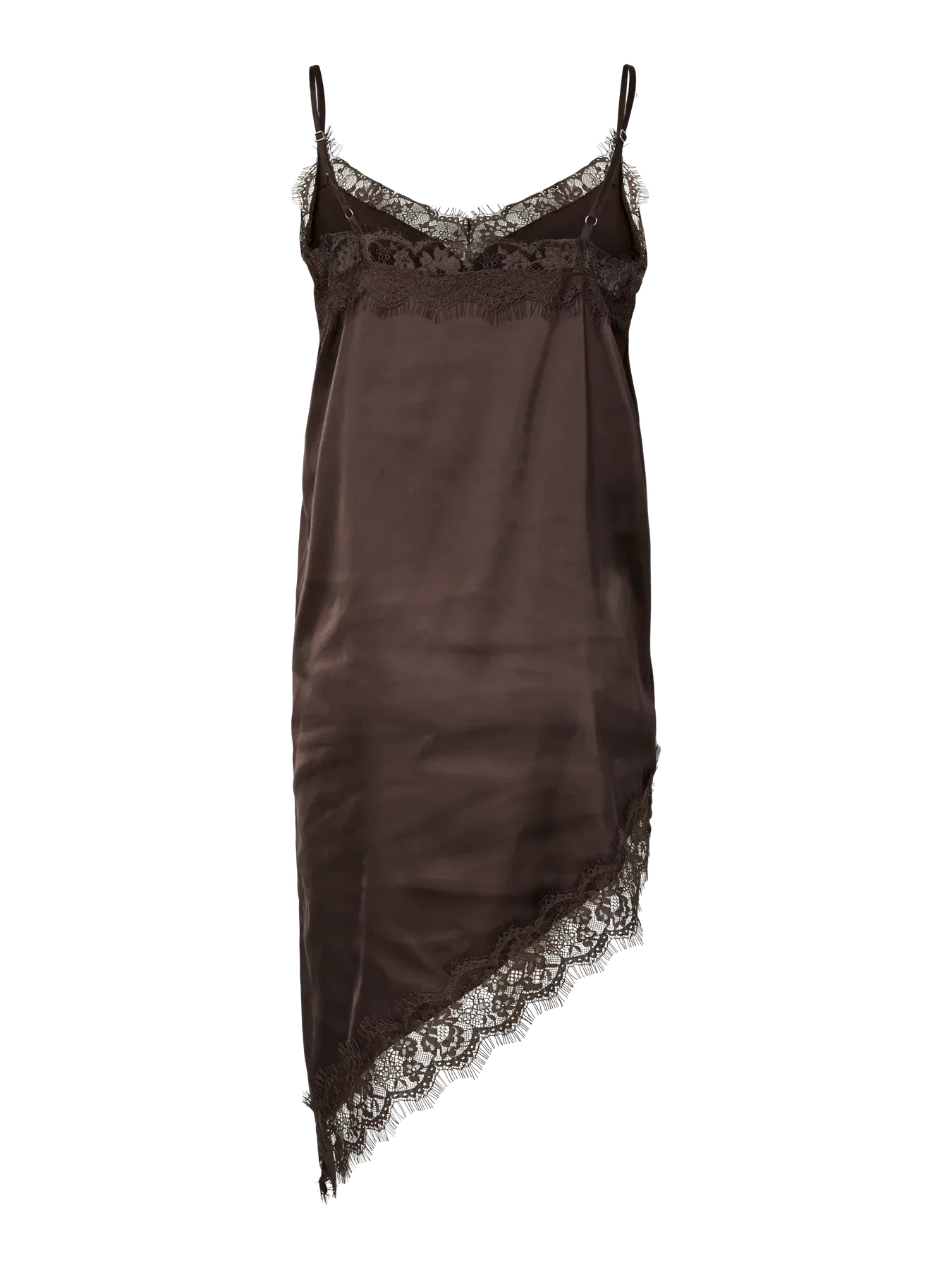 Bruine satijnen jurk van Pieces met kantdetails en spaghetti-bandjes. De jurk heeft een V-hals en een asymmetrische zoom onderaan.