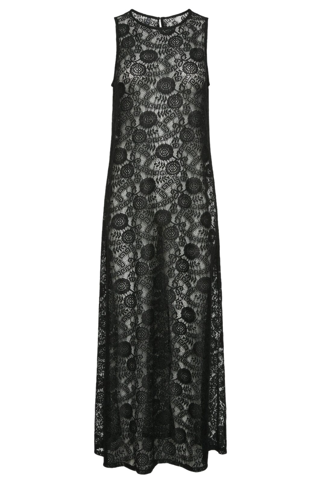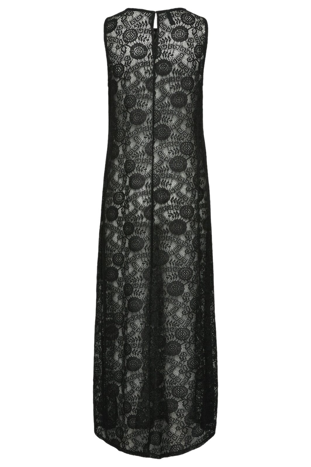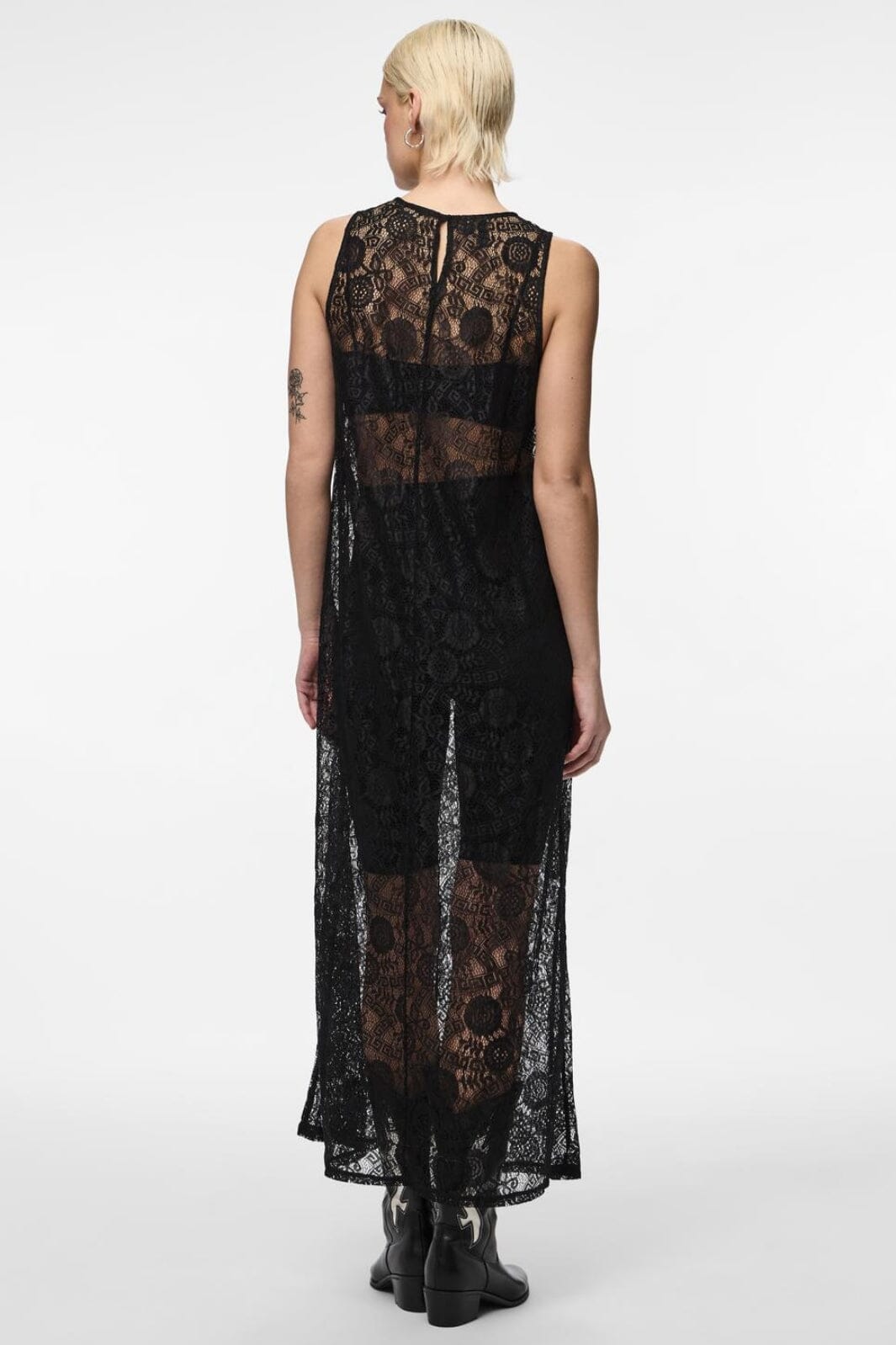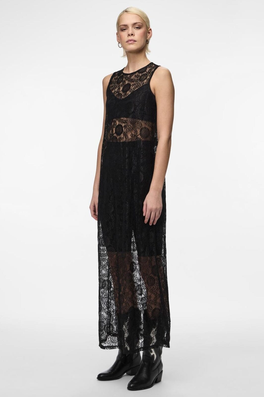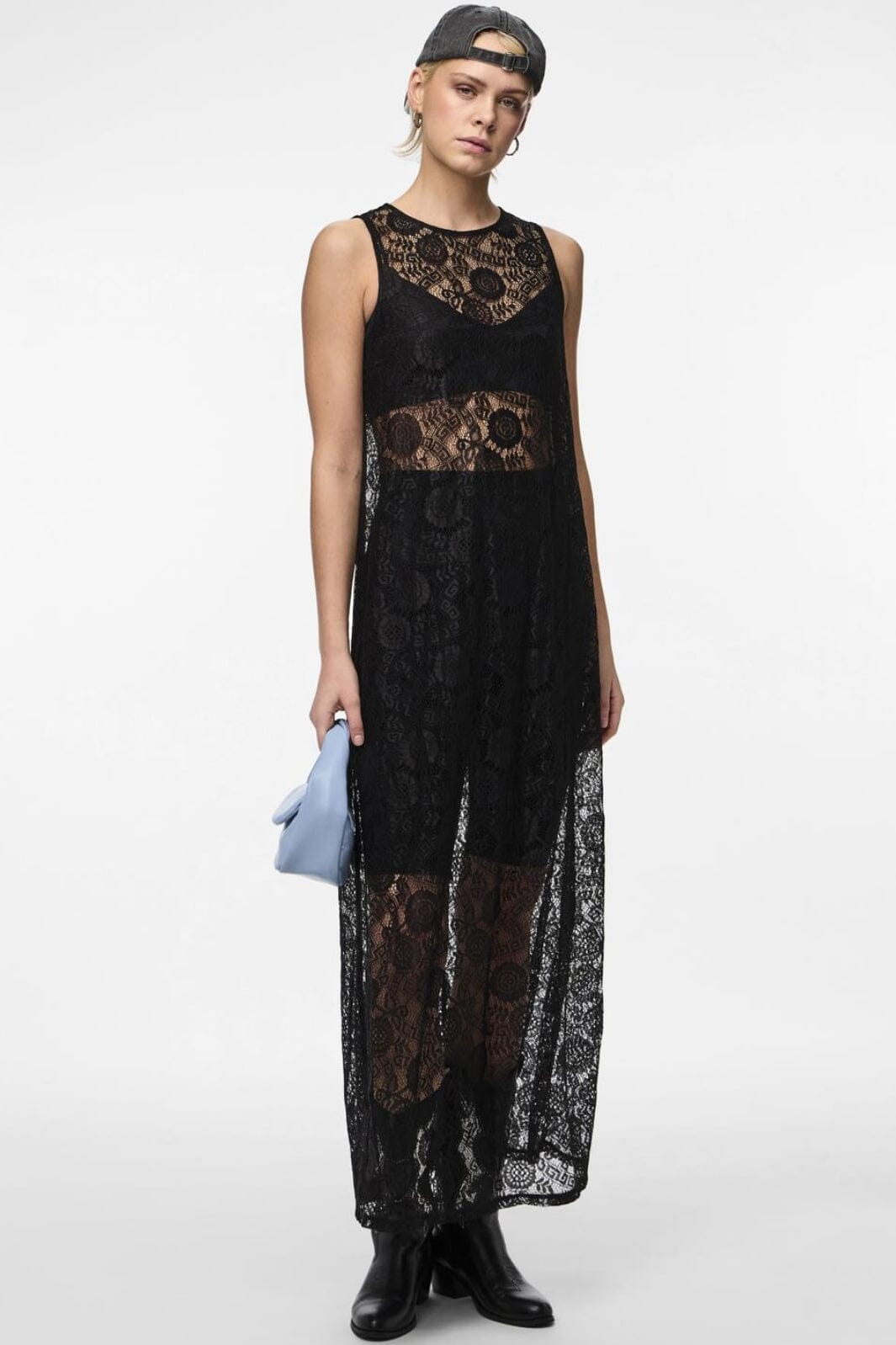 Zwarte kanten jurk van Pieces met bloemenpatroon. De jurk heeft een ronde halslijn en reikt tot de enkels. Het mouwloze ontwerp en het kantmateriaal geven de jurk een lichte uitstraling.