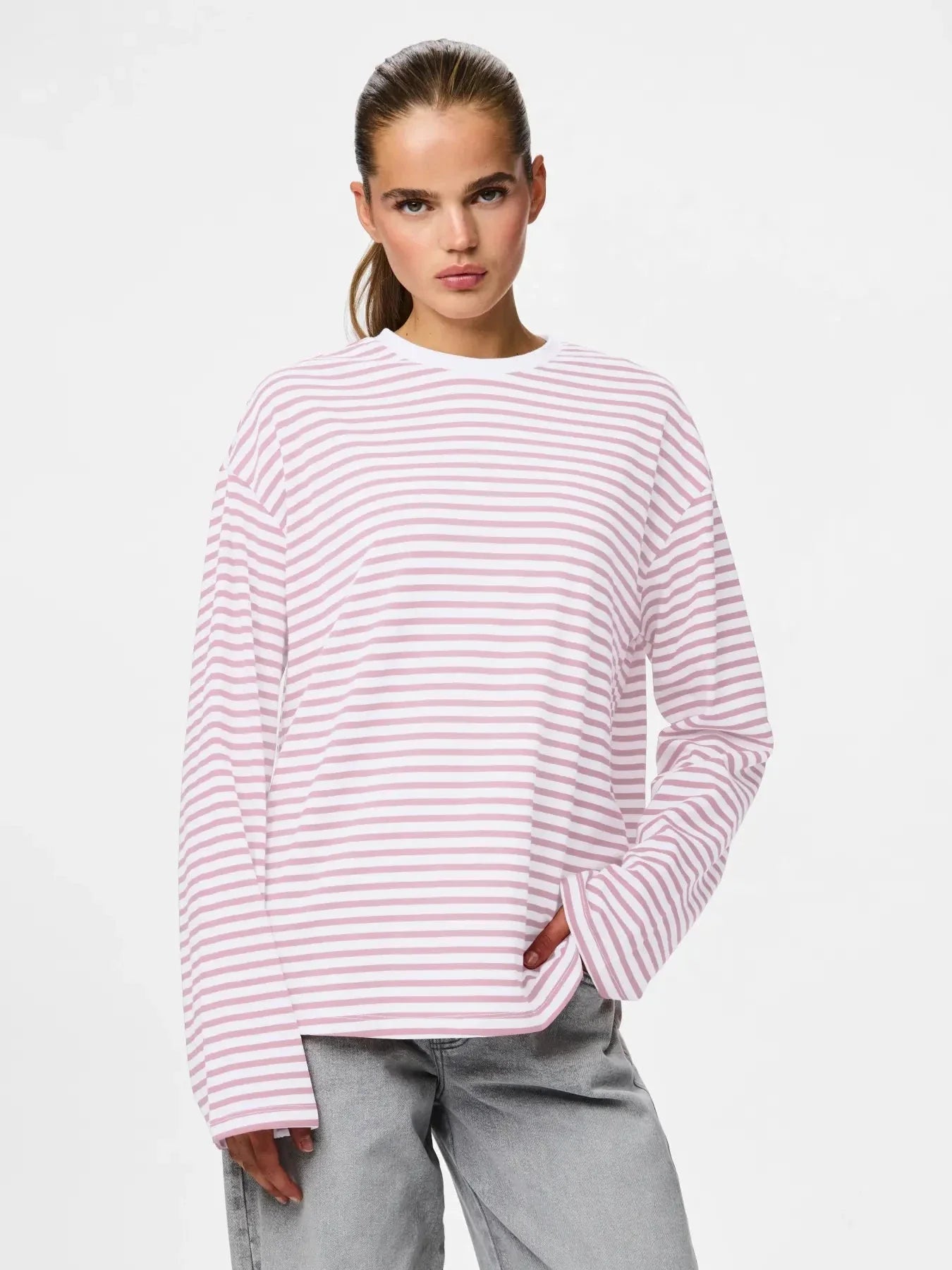 Top met lange mouwen van Pieces met strepen in wit en lichtroze. Gemaakt van 75% katoen en 25% polyester.