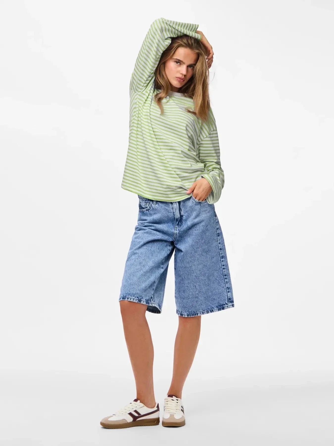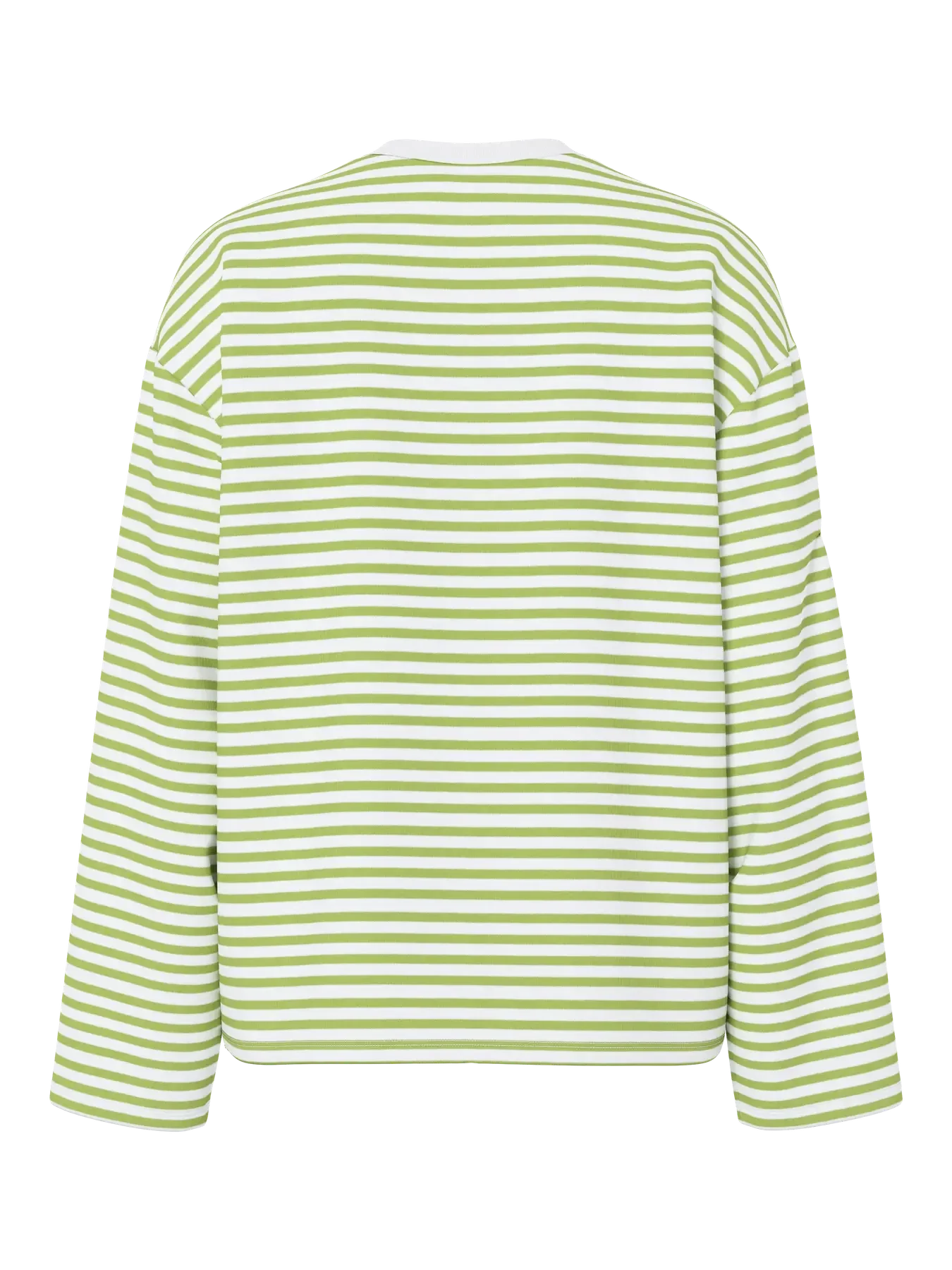 Top met lange mouwen van Pieces met groene en witte strepen. De top heeft een ronde halslijn met een witte rand en een oversized pasvorm.