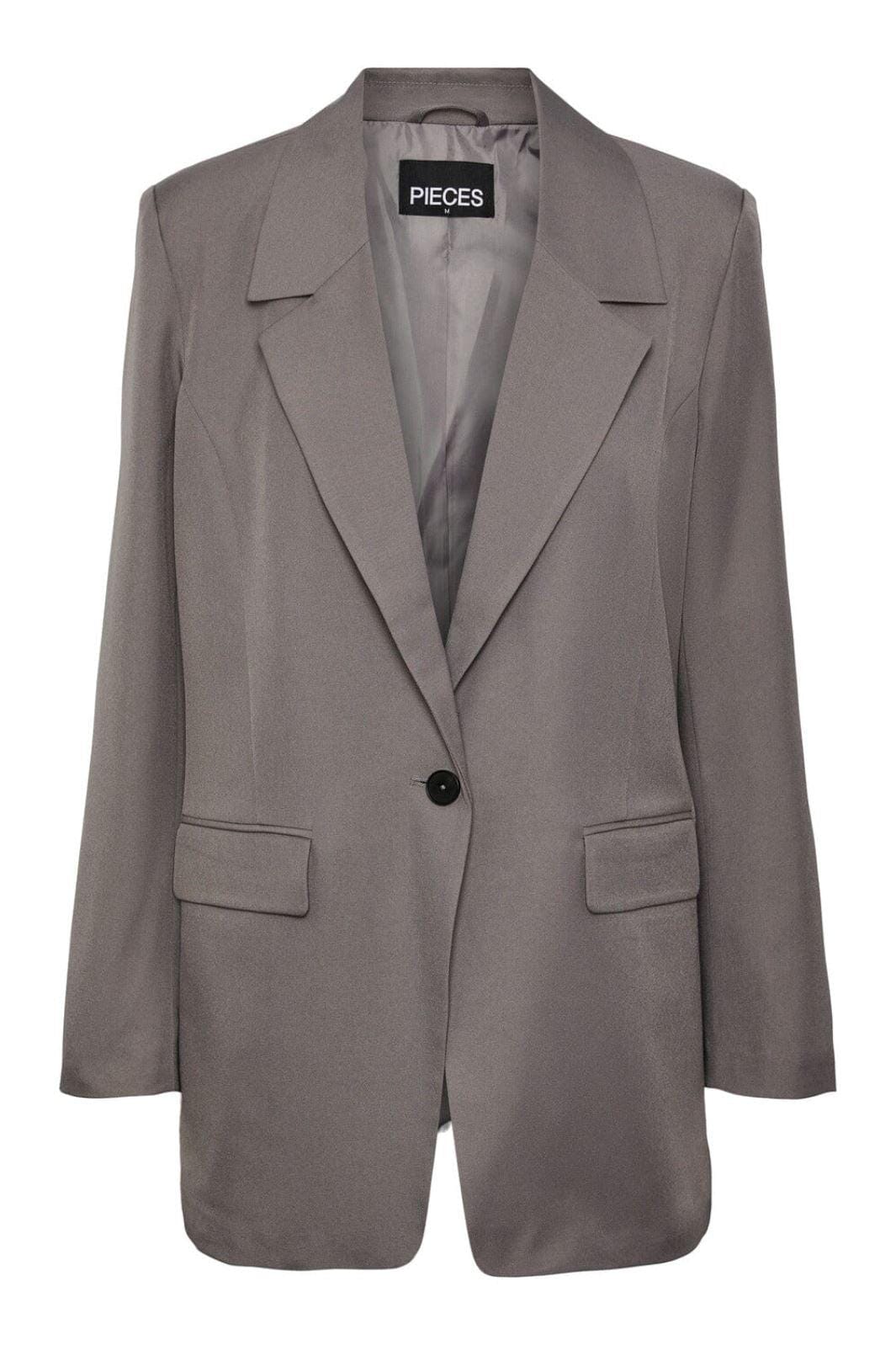Grijze blazer van Pieces met oversized pasvorm. De blazer heeft een overhemdkraag, lange mouwen en knopen als sluiting. De gedempte grijze tint maakt het gemakkelijk om te stylen.