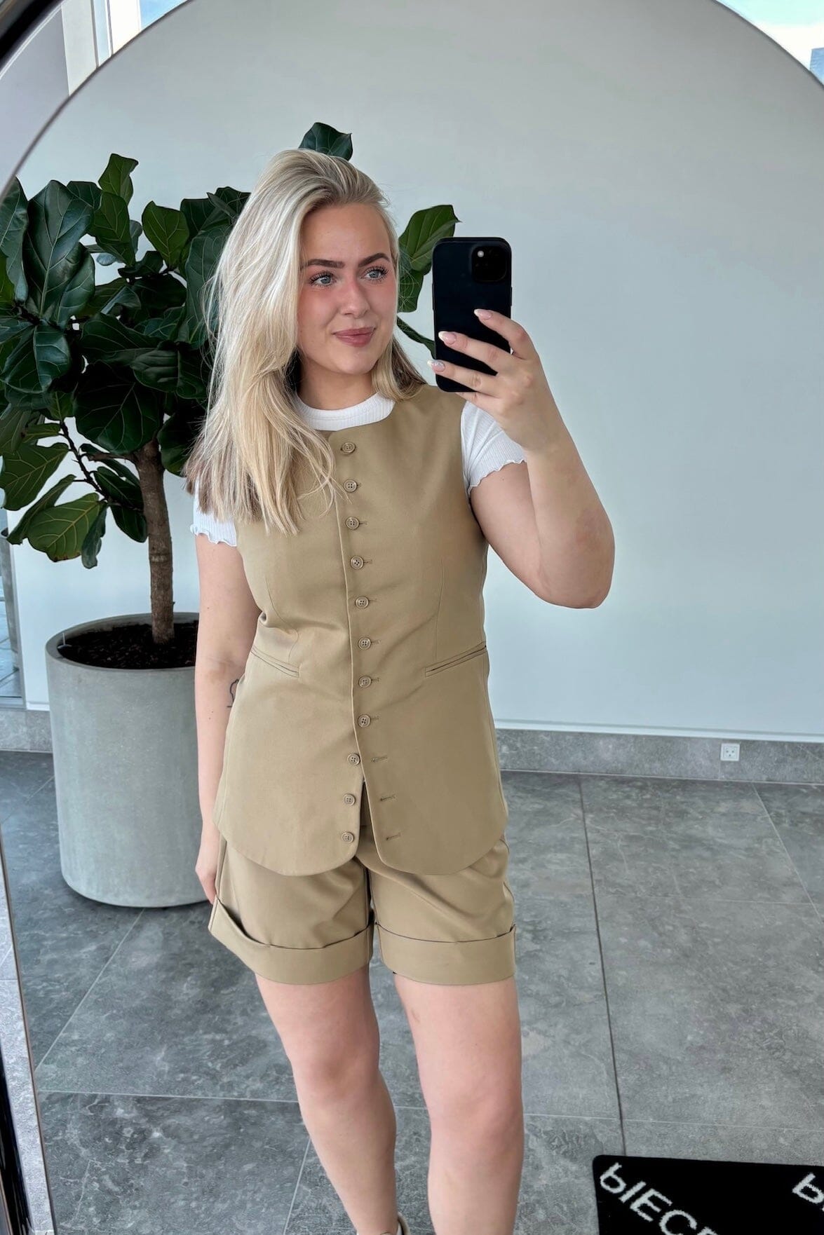 Een lange vest van Pieces in een lichte beige tint. De vest heeft een getailleerde snit met knoopsluiting aan de voorkant en praktische voorzakken. Het kan worden gestyled voor zowel dagelijks gebruik als op kantoor.