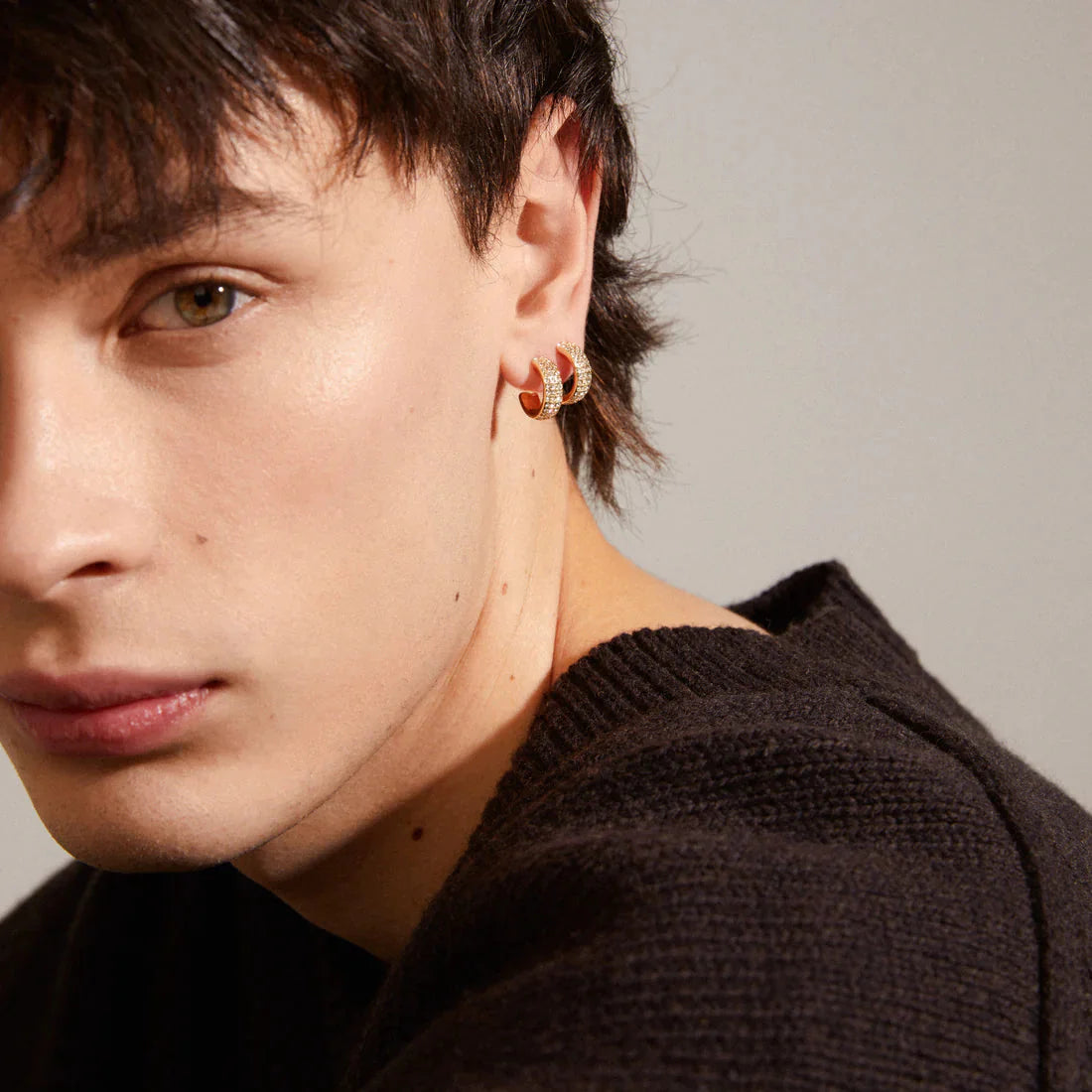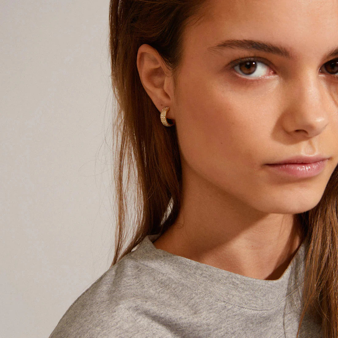 Goudplated oorbellen van Pilgrim met Preciosa-kristallen. De oorbellen hebben een gebogen vorm van 14 mm en zijn versierd met kristallen in een patroon dat het licht vangt.