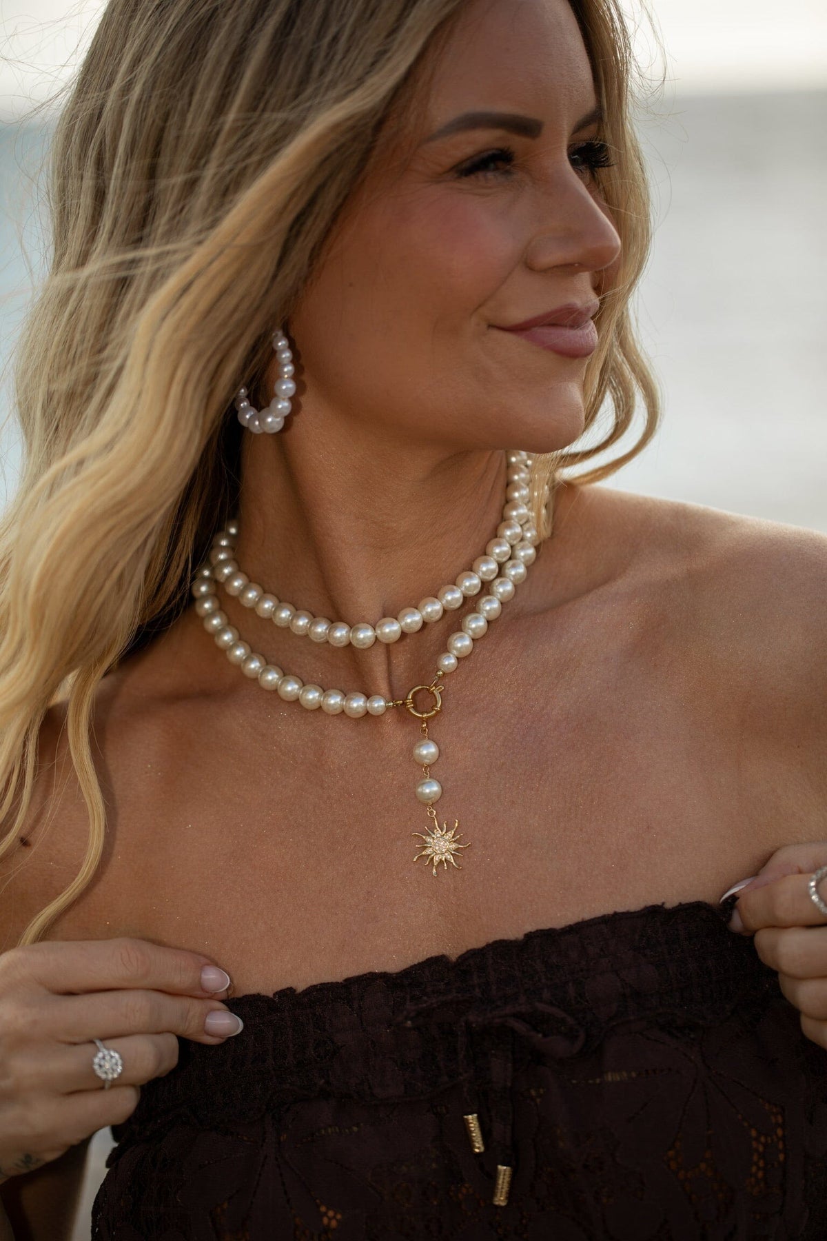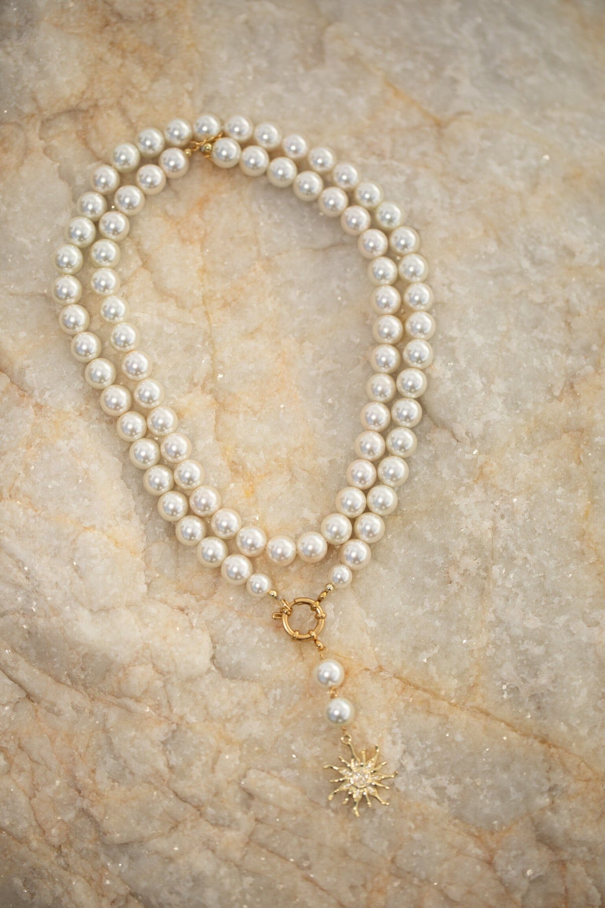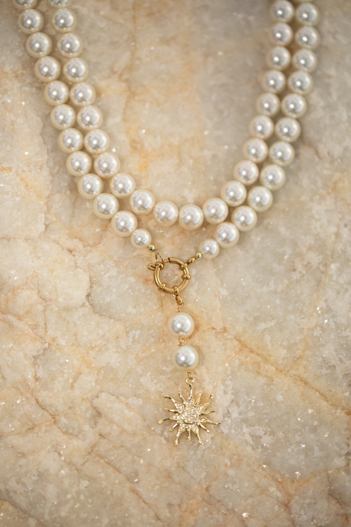 Chokerketting van Rooted met twee rijen kralen en schelpen en een zonvormige hanger. De ketting is verguld en heeft een goudkleurige sluiting.