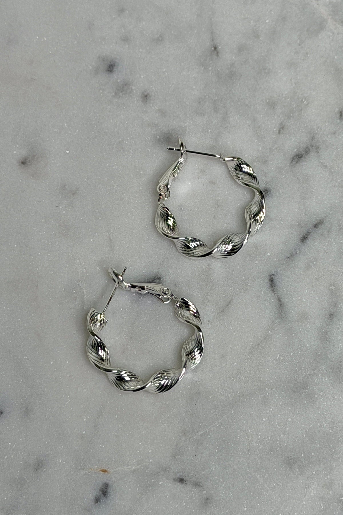 Verzilverde oorbellen van Rooted met een gedraaid design. De ronde hoops hebben een zichtbaar sluitsysteem dat zorgt voor een stevige bevestiging.