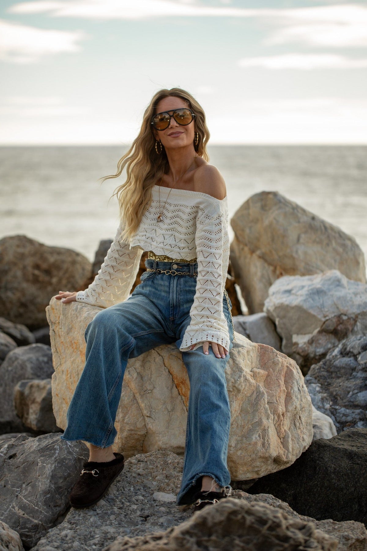 Ketting van Rooted met een dunne goudkleurige ketting en meerdere hangers. De ketting heeft een koordhanger met schelpen en vergulde charms.