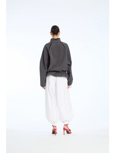 Grijze fleecejas van Rotate met smalle krijtstrepen. De jas heeft een halve ritssluiting en decoratieve stiksels langs de mouwen.