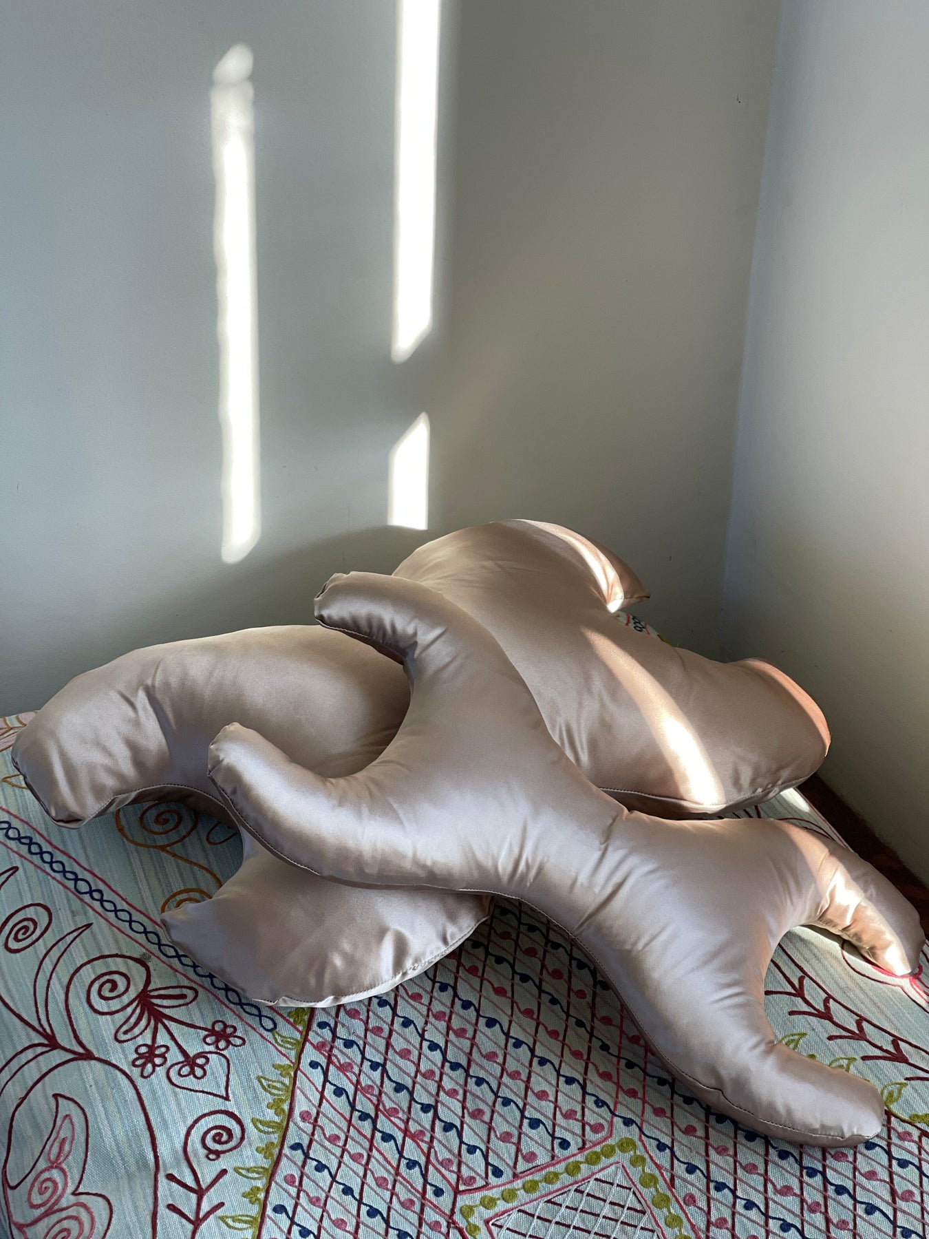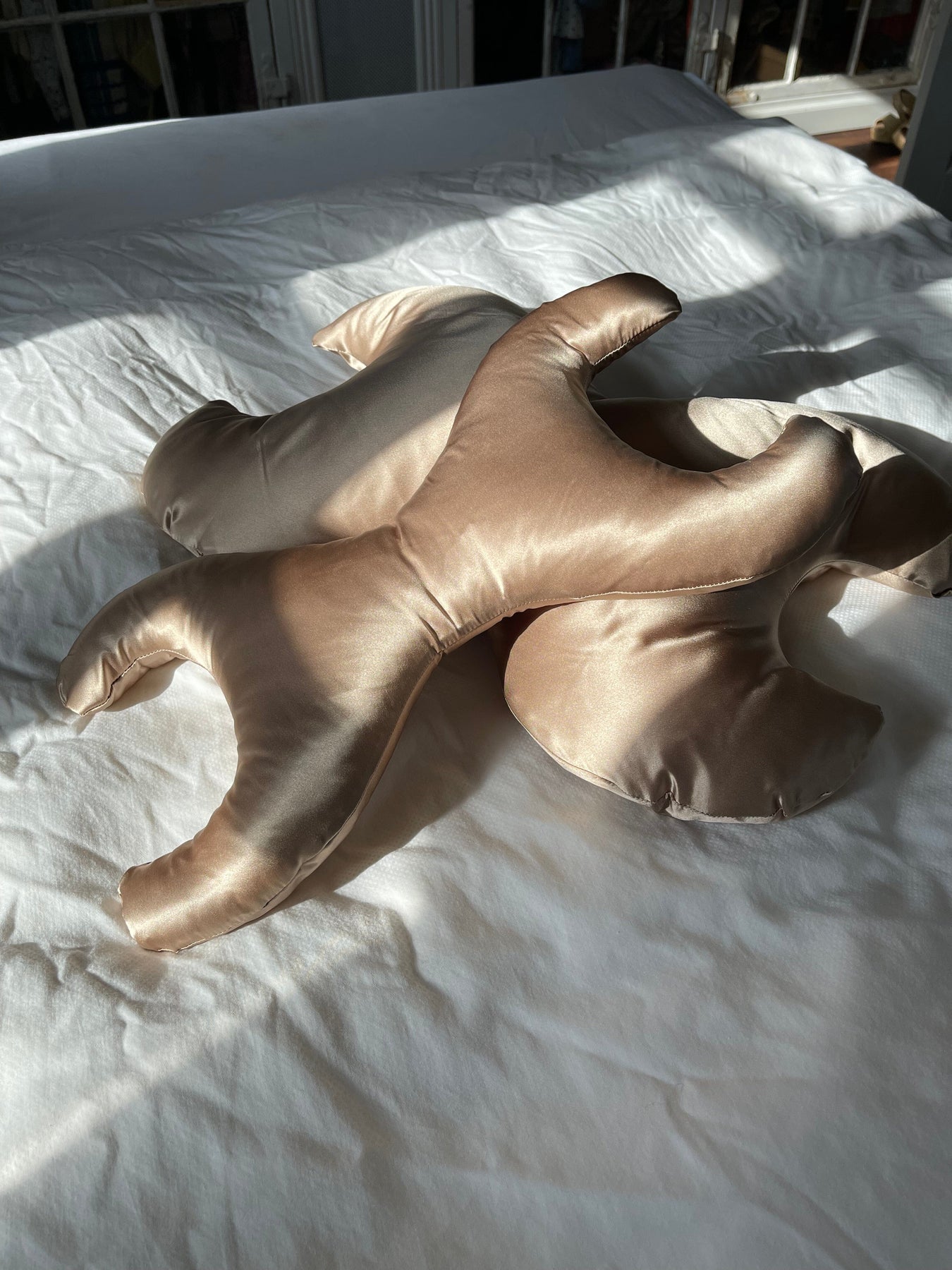 Klein kussen met bronzen zijden hoes van Save My Face. De kussen heeft een X-vormig ontwerp en combineert allergievriendelijke vezels met temperatuurregulerende zijde.