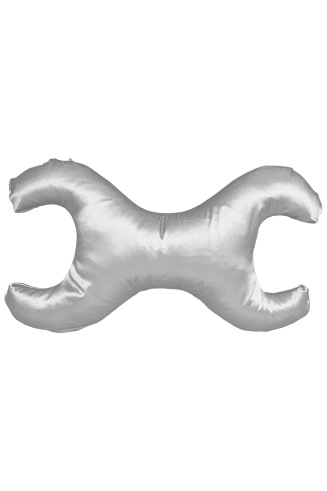 Klein kussen met zandloper vorm van Save My Face. Het zilverkleurige kussen heeft een afneembare hoes van zijde en is ontworpen om slaaprimpels te verminderen.