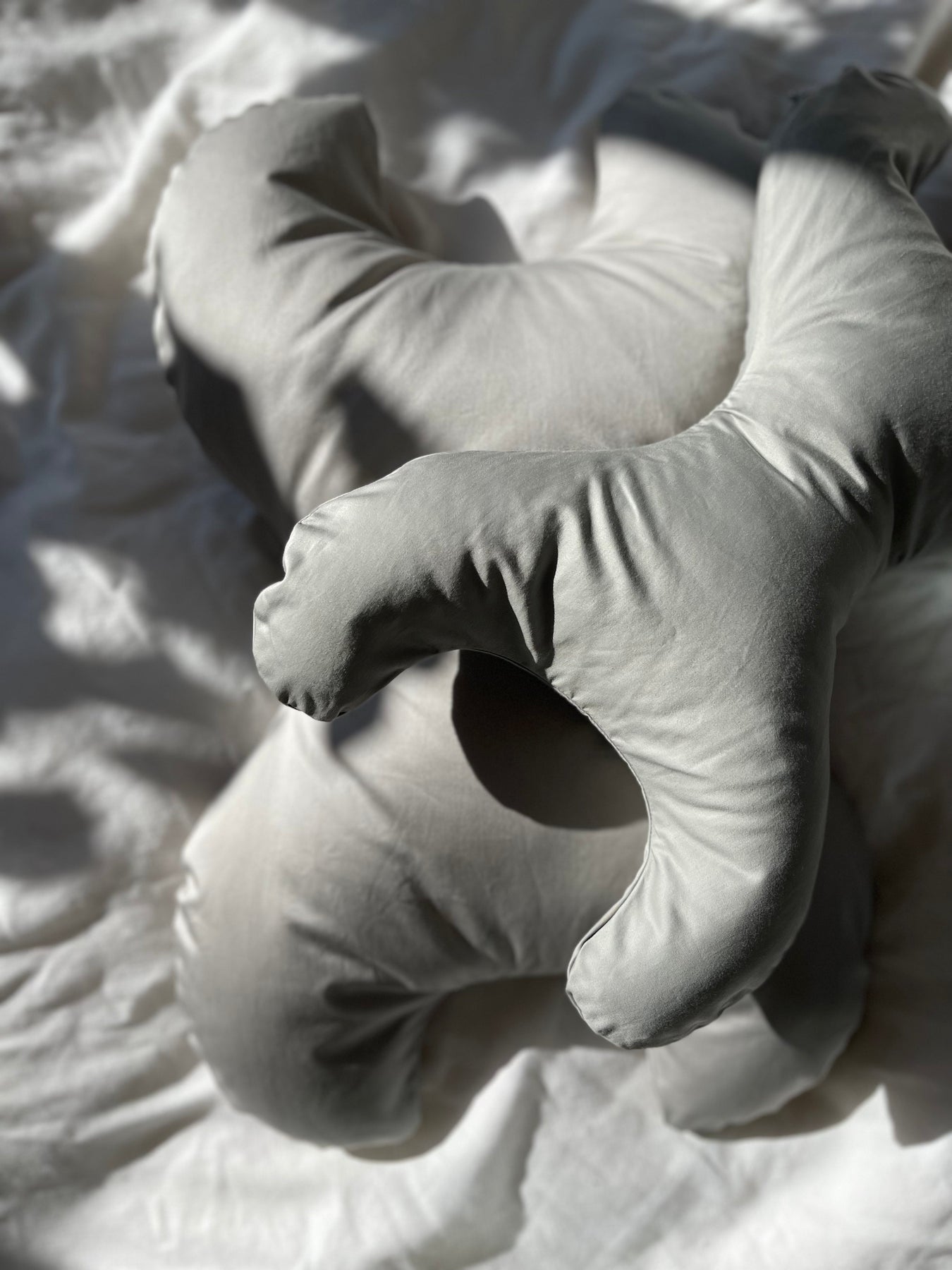 Grijze kussen met gepatenteerde zandloper vorm van Save My Face. Het speciale ontwerp houdt het gezicht vrij tijdens het slapen, en de afneembare hoes maakt het gemakkelijk om schoon te houden.
