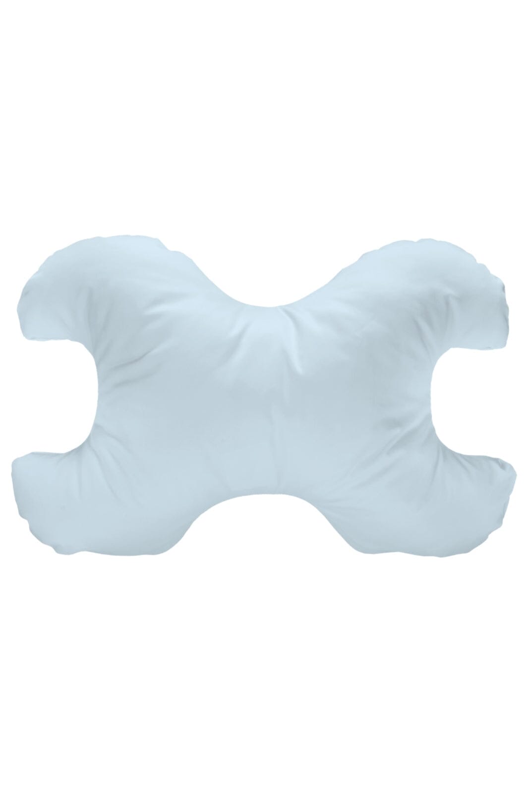 Groot kussen met een gepatenteerd ontwerp dat het gezicht vrij houdt tijdens het slapen. Het lichtblauwe kussen heeft een afneembare hoes en is gevuld met bacteriewerende vezels.