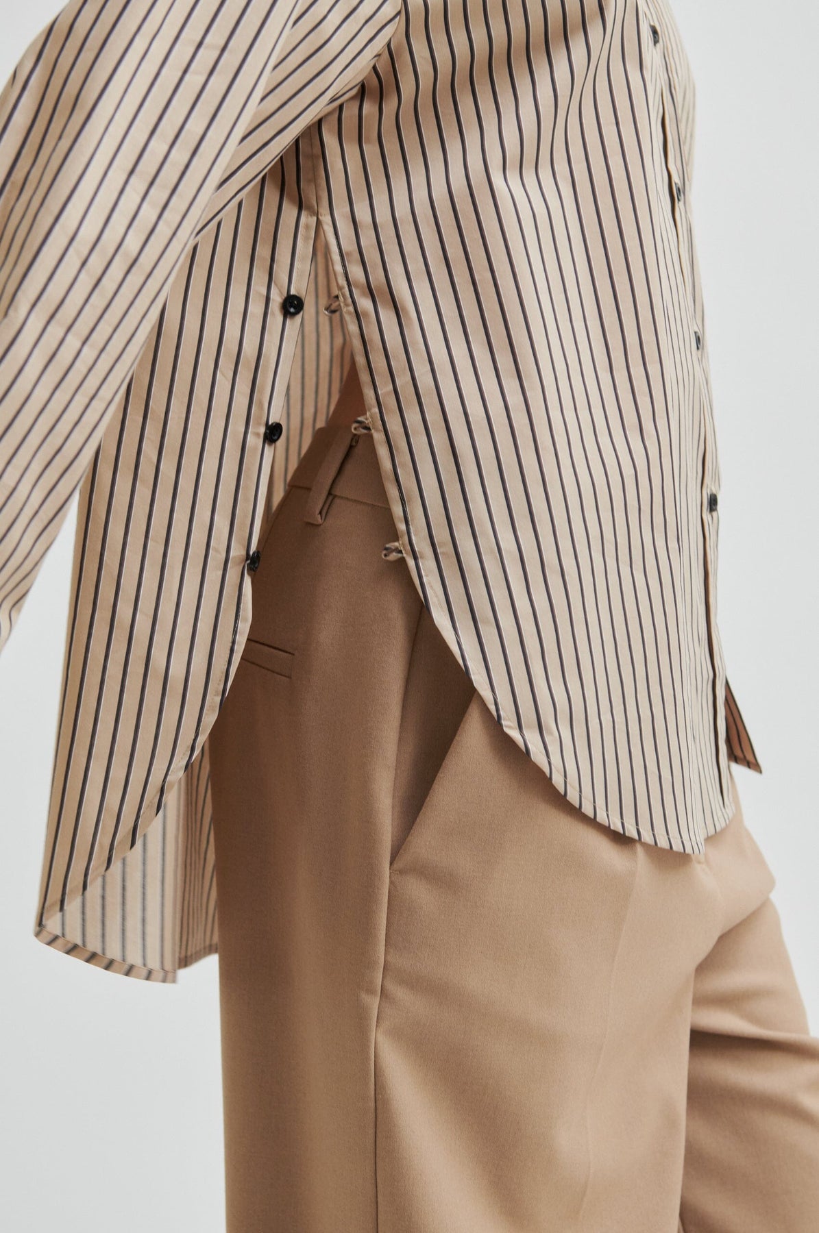 Gestreept shirt van Second Female in een camelkleurige katoenmix. Het shirt heeft een klassieke overhemdkraag en een doorlopende knoopsluiting aan de voorkant.