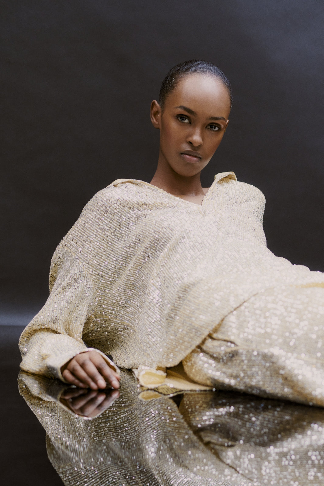 Second Female pailletbluse med bittesmå, runde pailletter på halvgennemsigtigt mesh. Kjolen har åben hals med krave og skjortemanchetter. Dropskuldre og formsyet søm. Helforet. Afslappet, lige pasform.