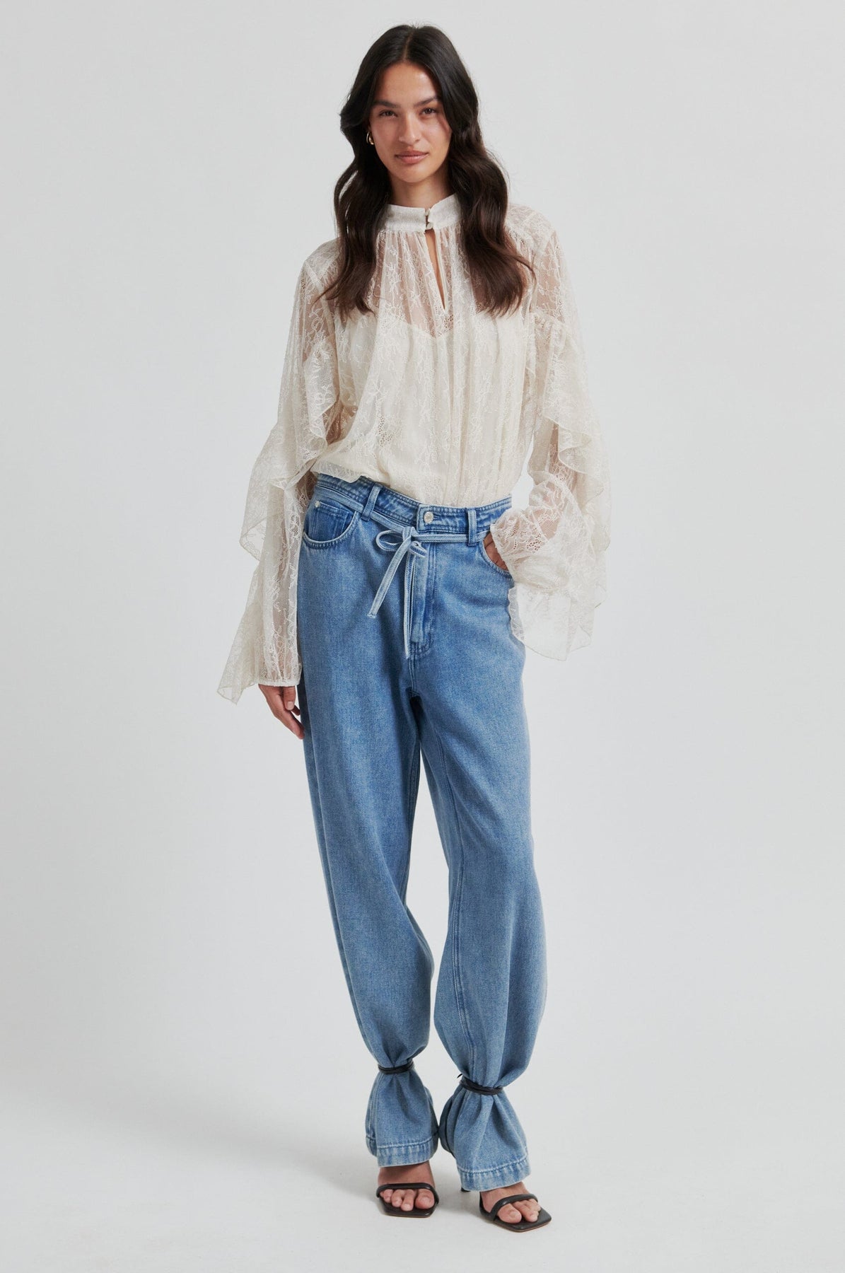 - Brede mouwen met gedraaide volantdetails