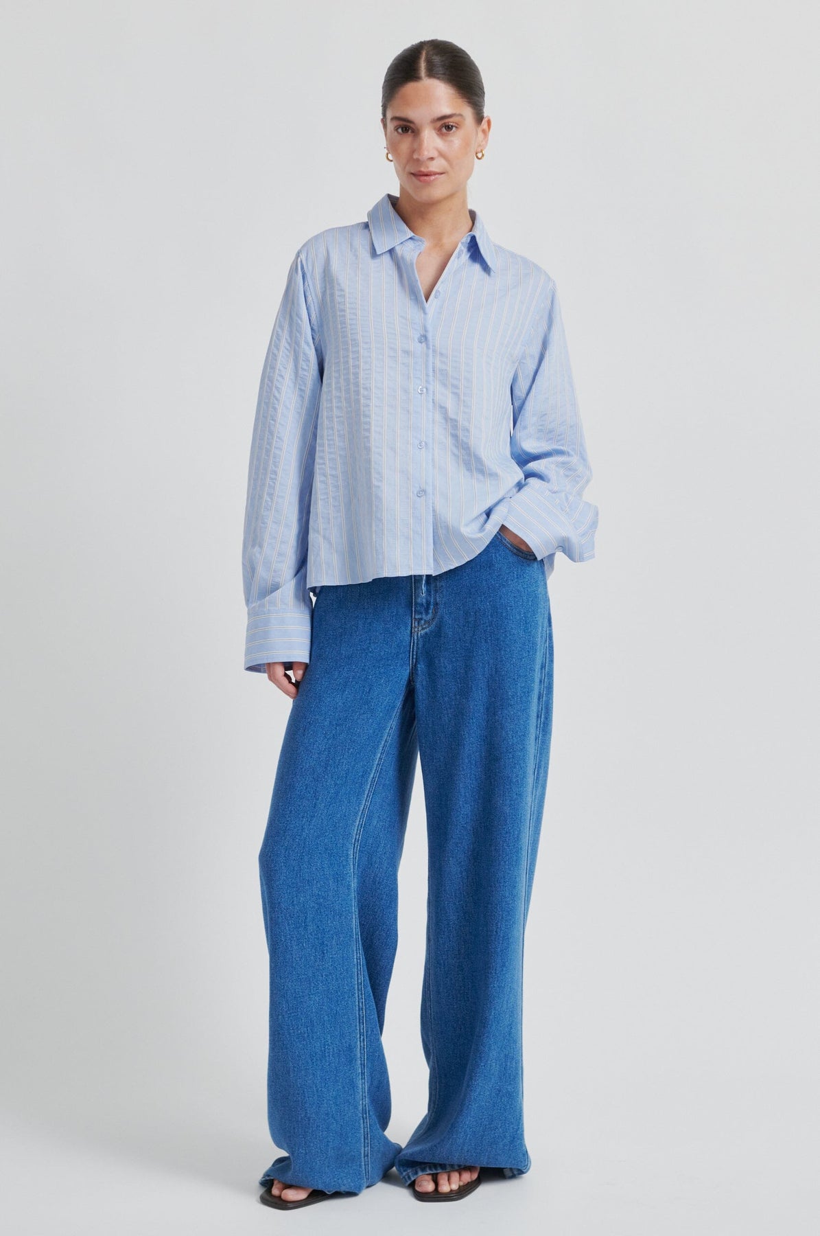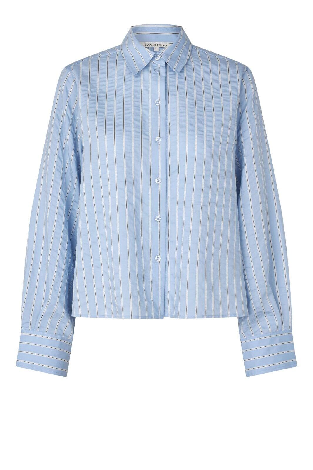 Lichtblauw overhemd met witte strepen van Second Female. Het overhemd is gemaakt van een zachte mix met 72% viscose en heeft een korte, wijde pasvorm.