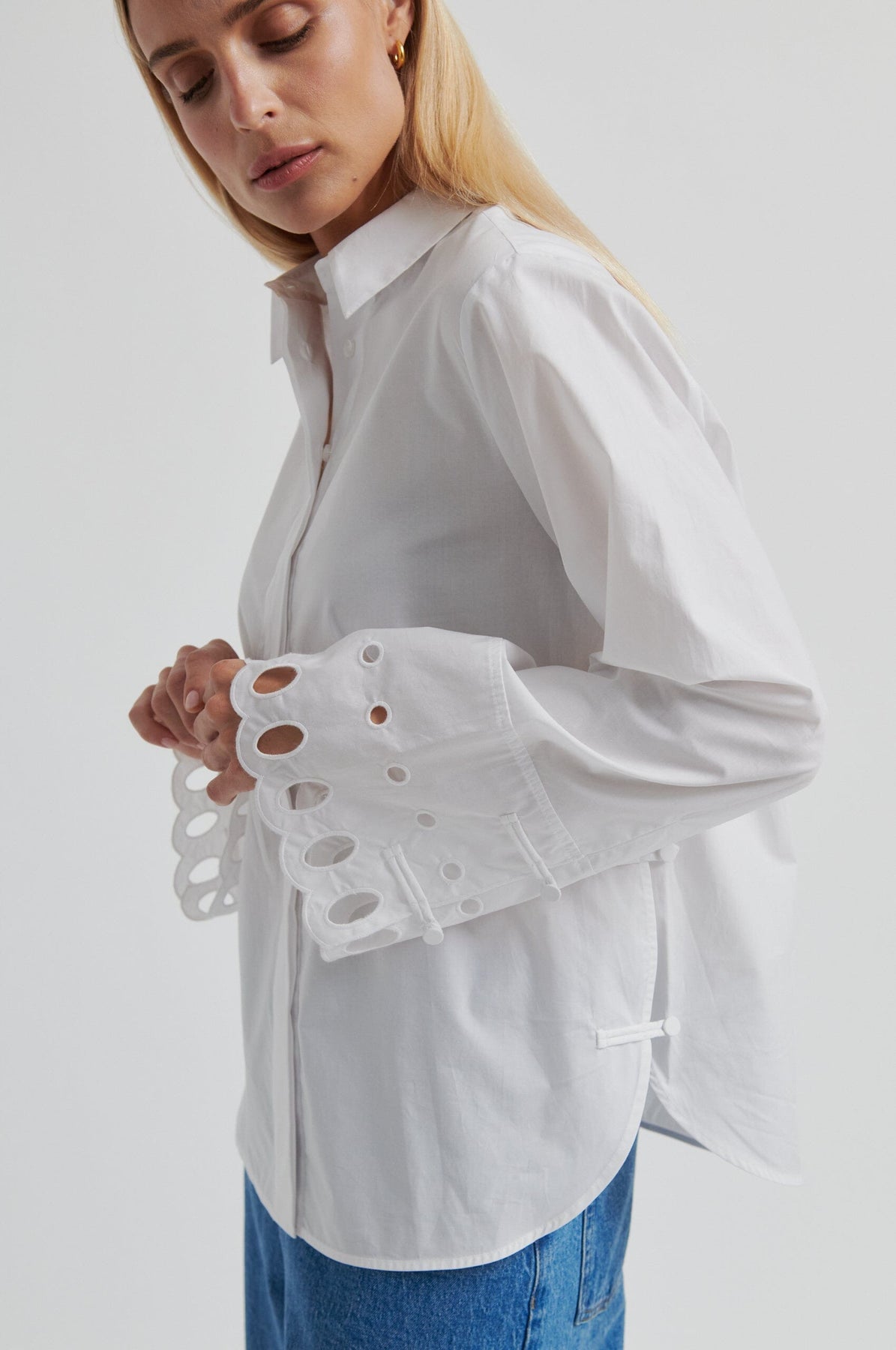 Wit overhemd van Second Female, gemaakt van 100% katoen. Het overhemd heeft een klassieke kraag, een volledig doorknoopsluiting en 3/4-mouwen met decoratieve uitsnijdingen bij de manchetten.