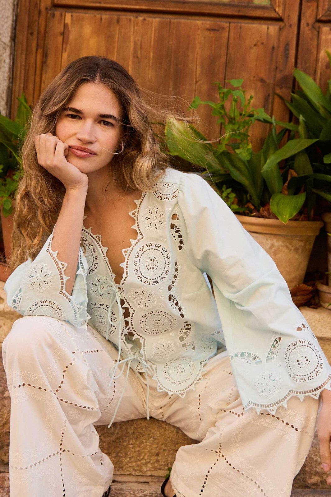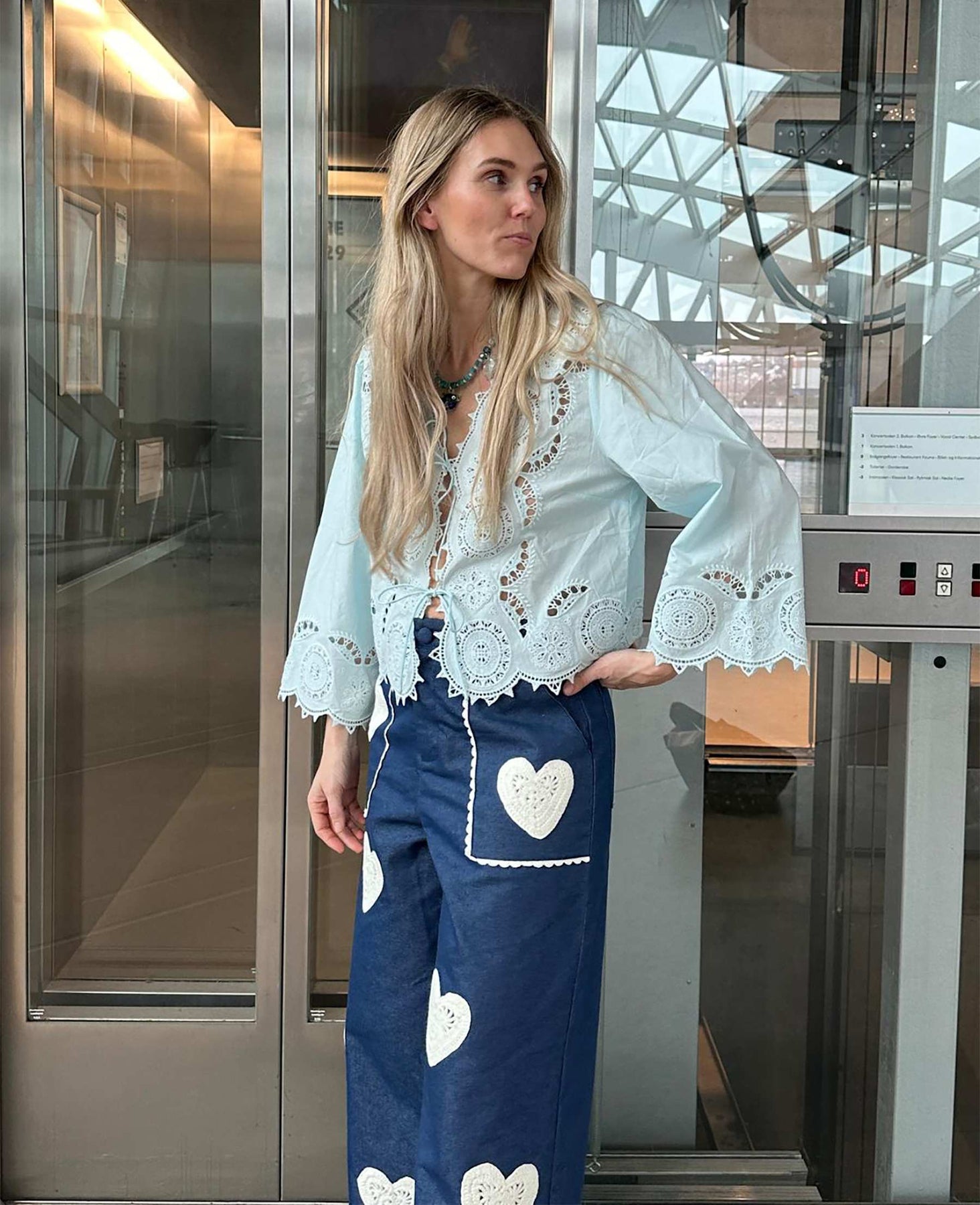 Lichtblau top van Sissel Edelbo in biologische katoen poplin. De top heeft geborduurde kantdetails langs de randen en de mouwen met cirkelvormige patronen.