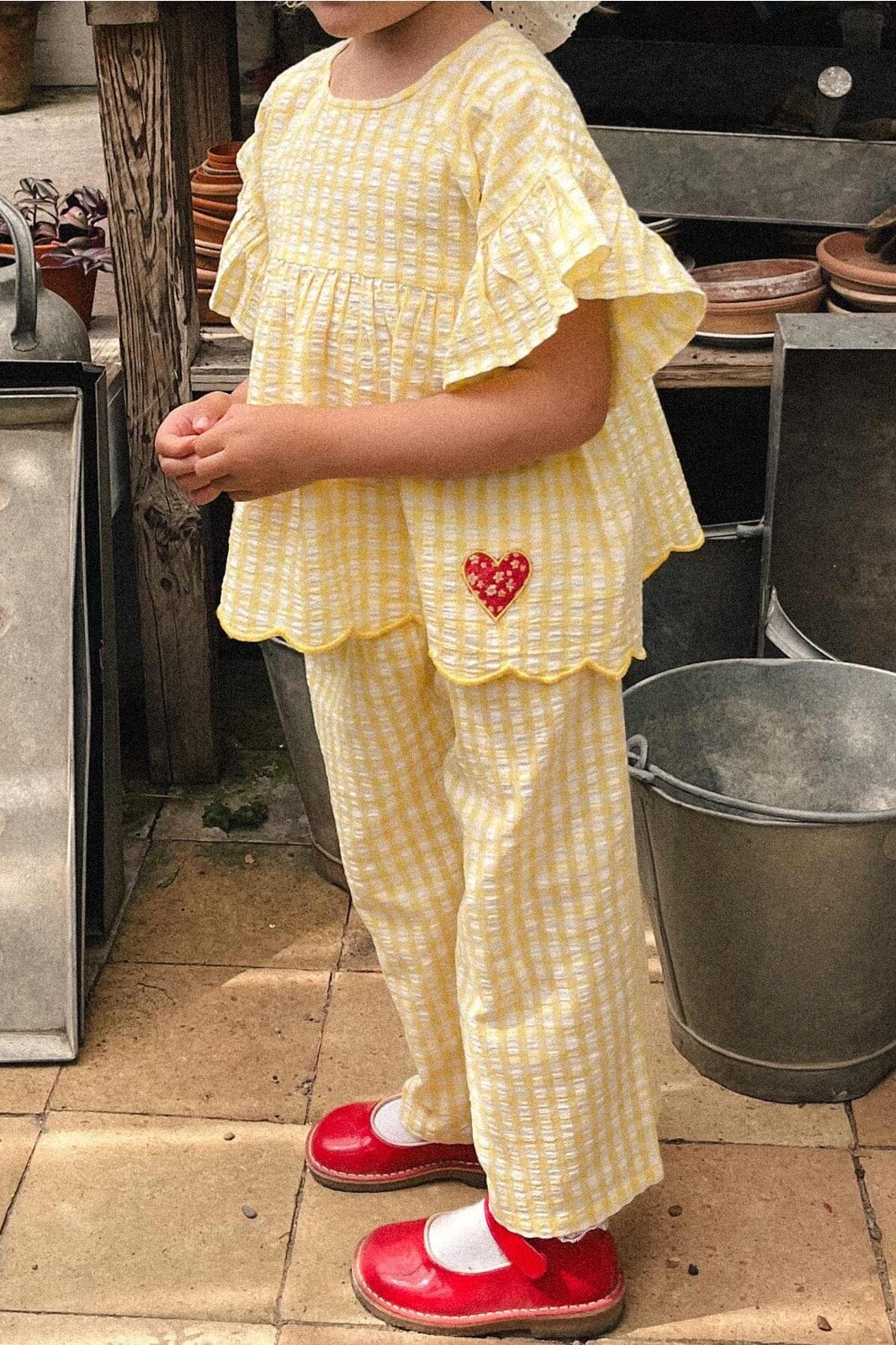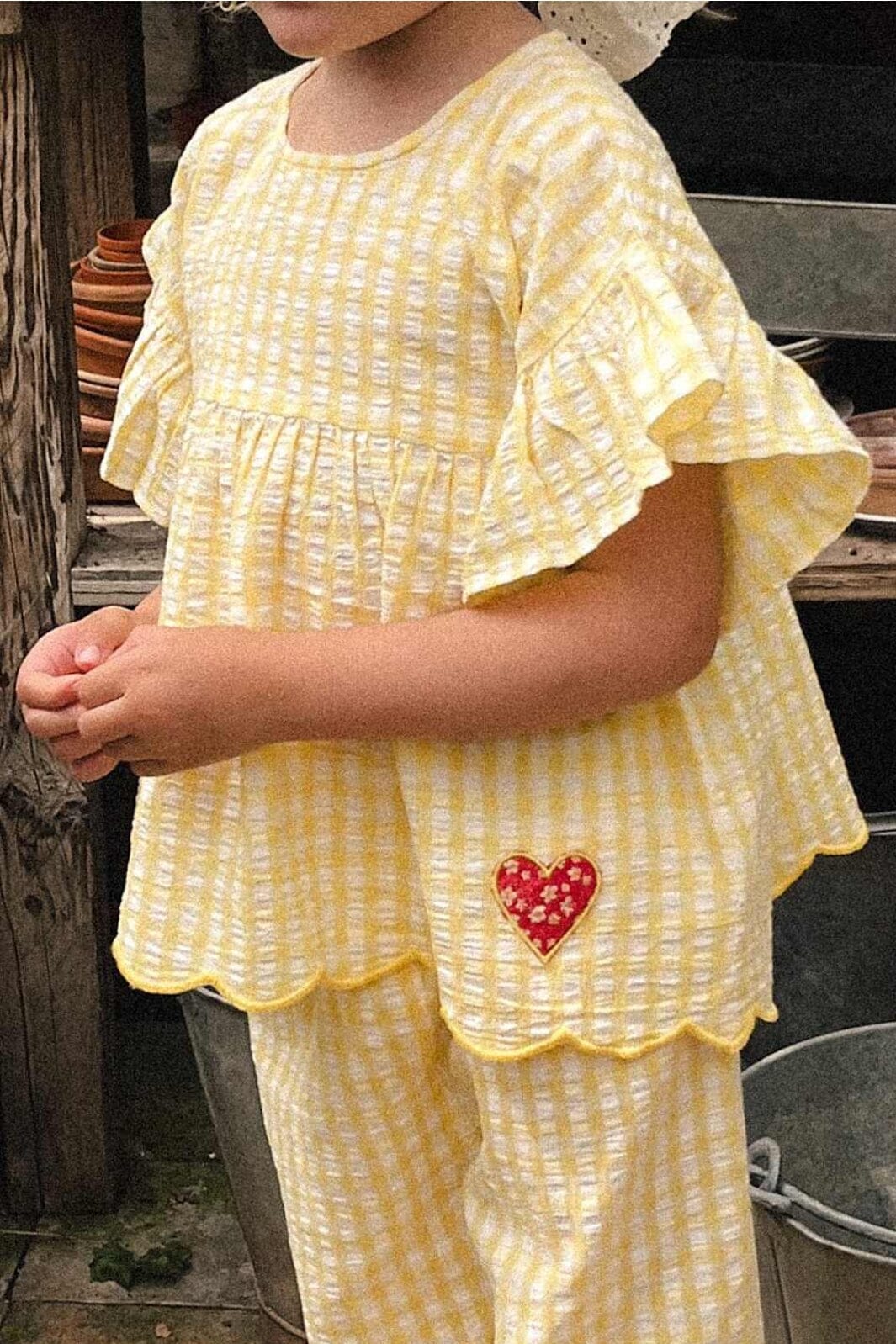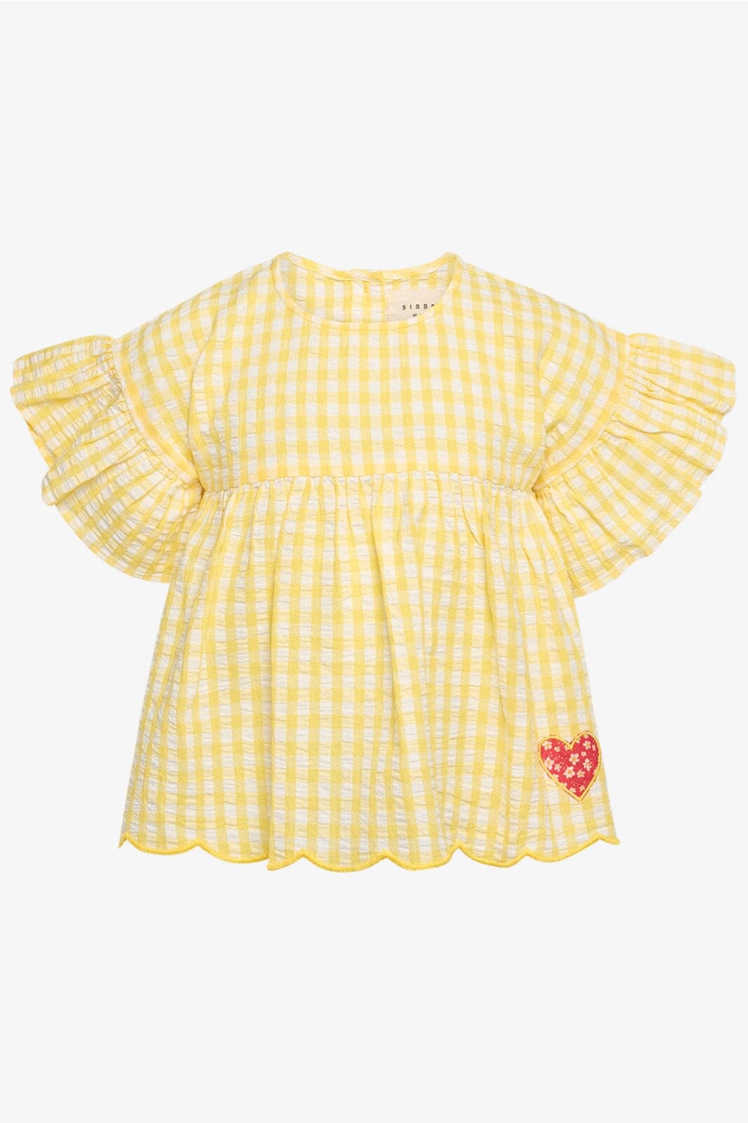 Geel geruit top van Sissel Edelbo in biologisch katoen. De top heeft volantmouwen en golvende rand onderaan, evenals een rood bloemetjeshart op de voorkant.