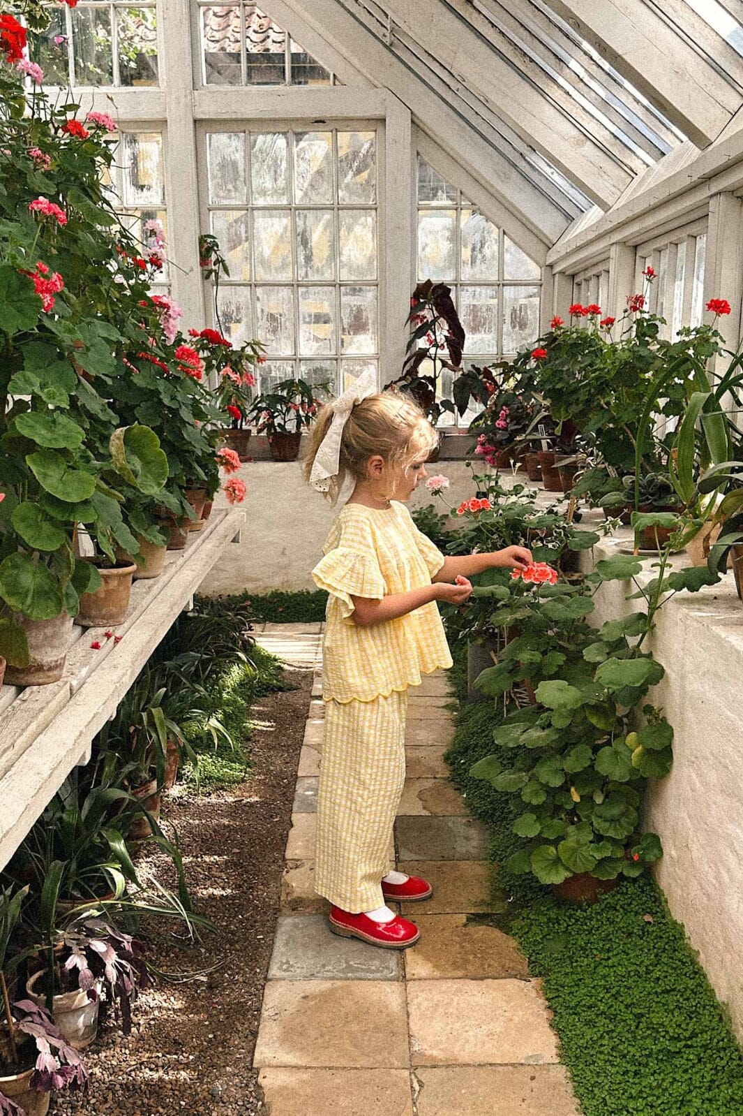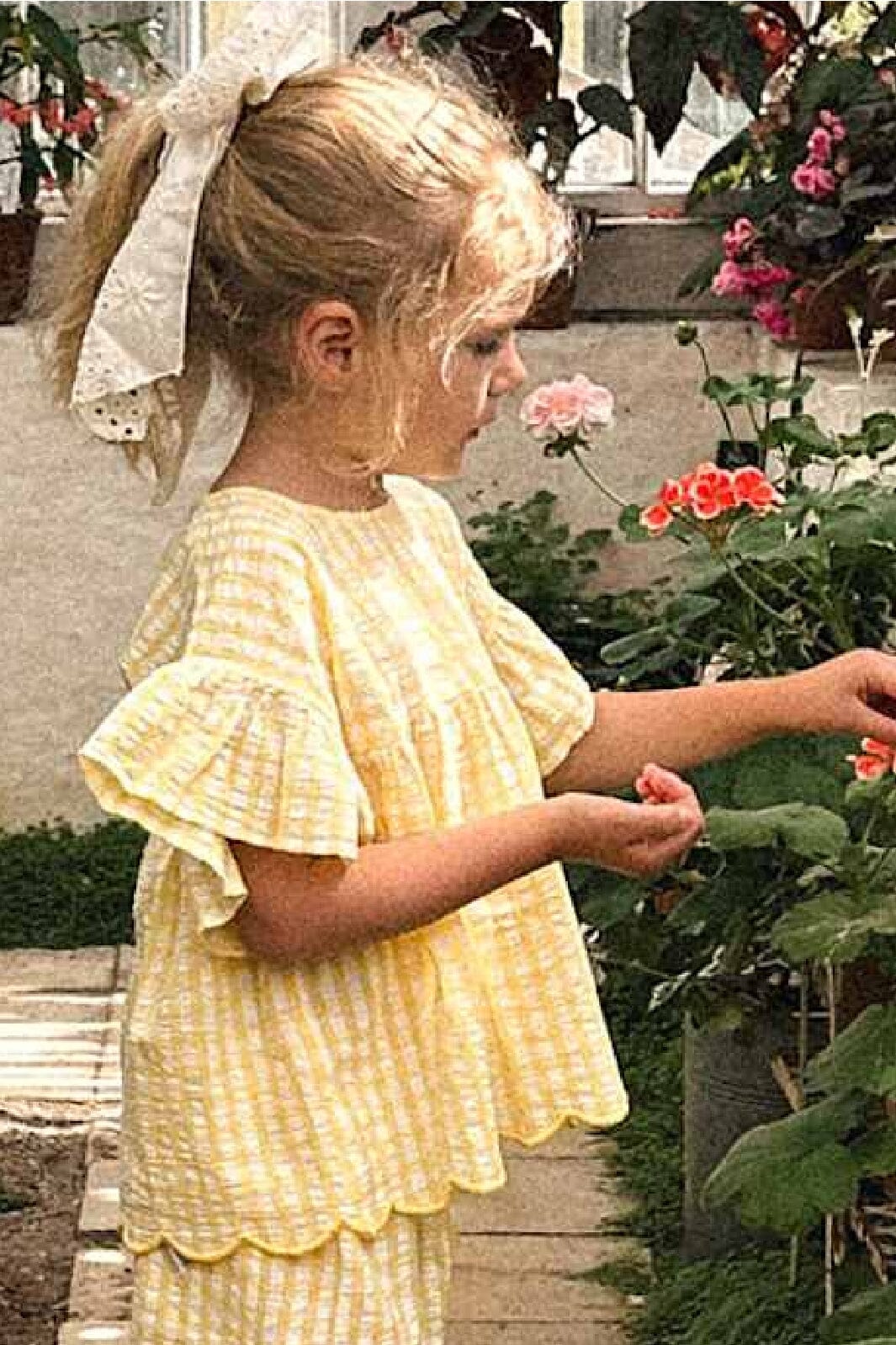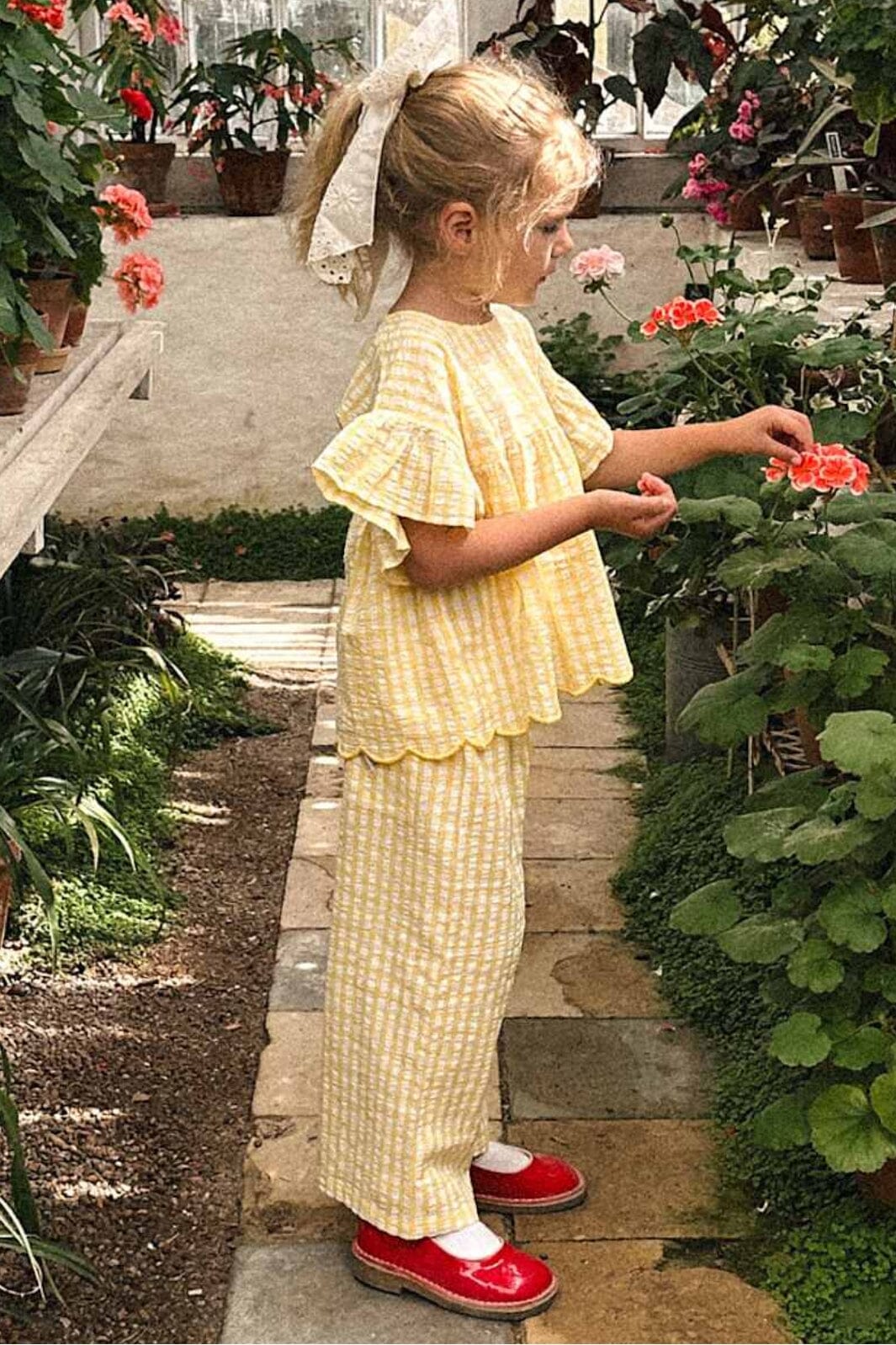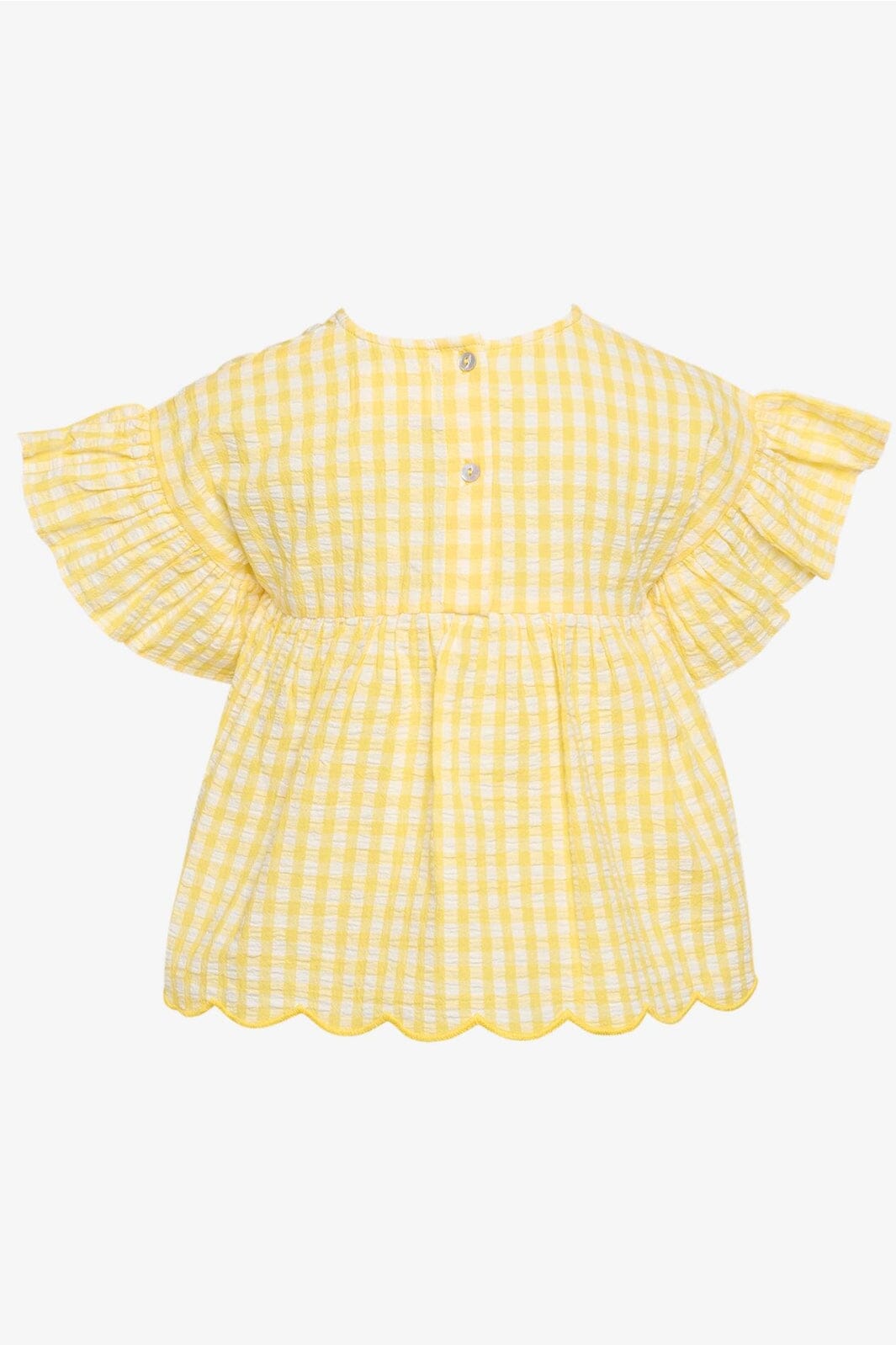 Geel geruit top van Sissel Edelbo in biologisch katoen. De top heeft volantmouwen en golvende rand onderaan, evenals een rood bloemetjeshart op de voorkant.
