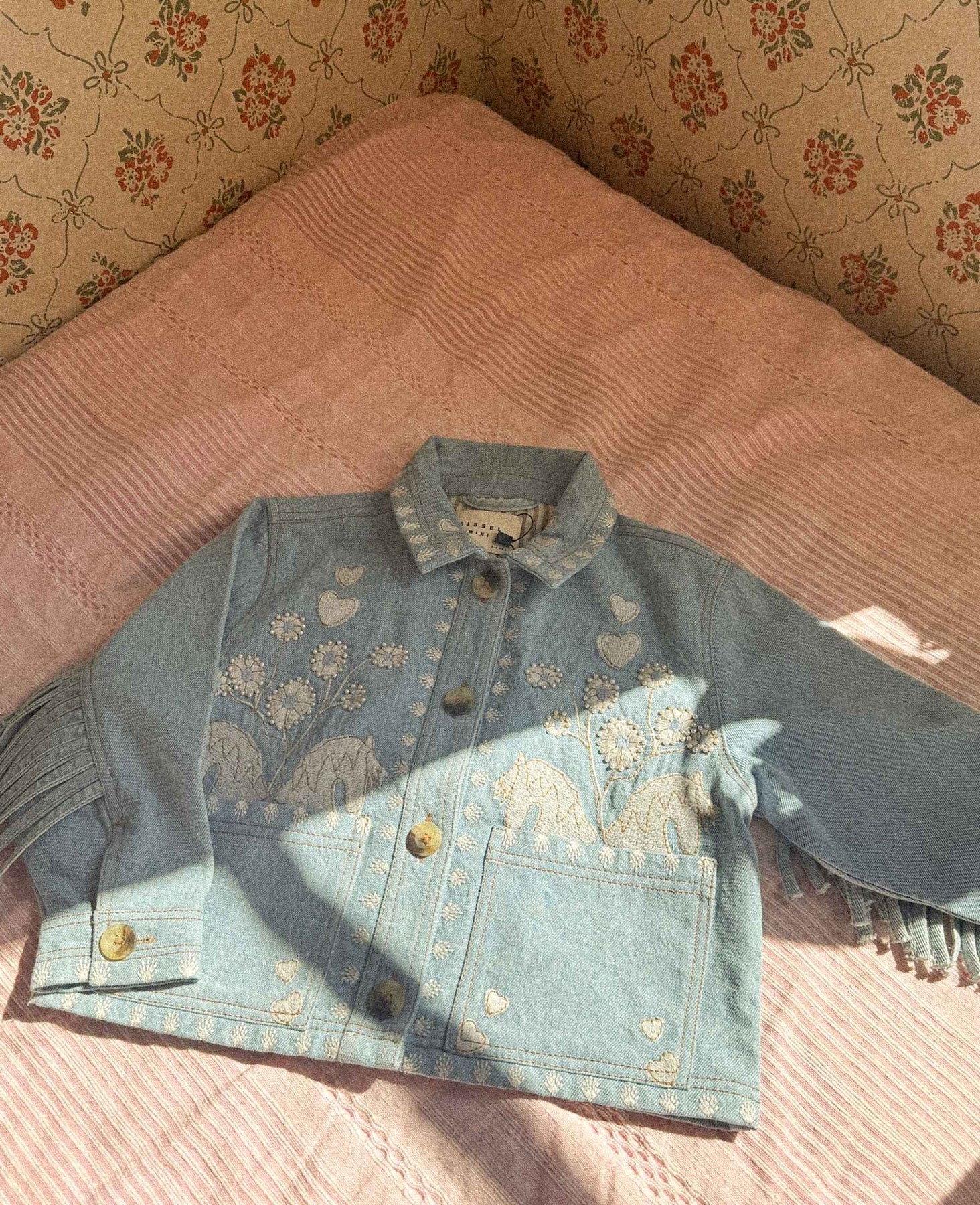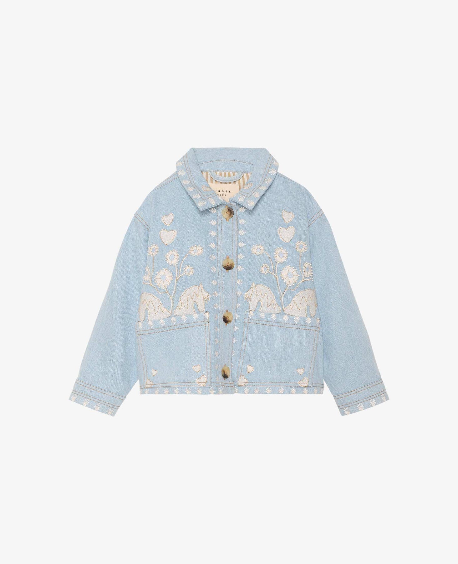 Lichtblauw denimjack van Sissel Edelbo met geborduurde bloemen en harten. Het jack heeft een oversized pasvorm met een overhemdkraag en knopen helemaal naar beneden.