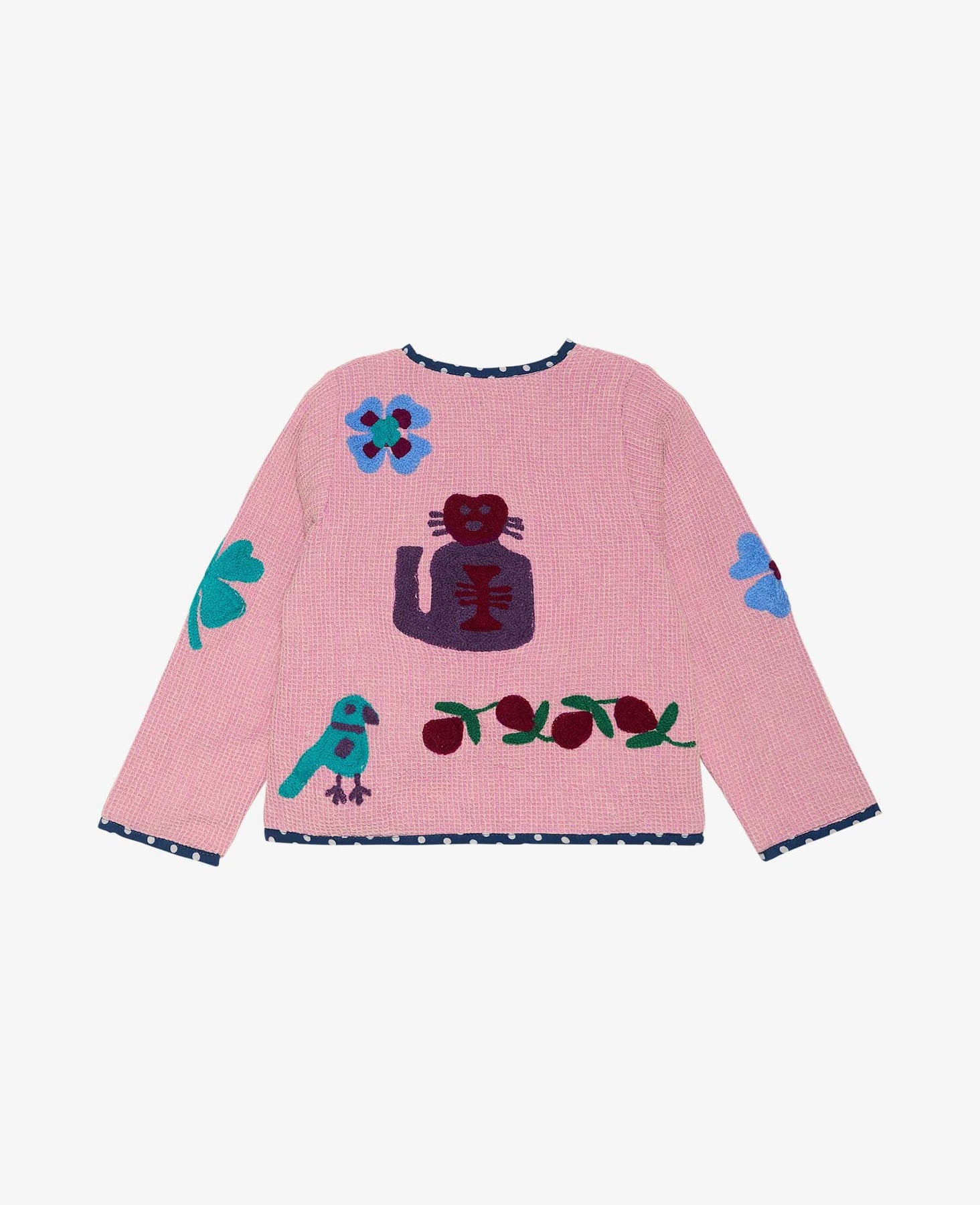 Roze jasje van Sissel Edelbo met handgemaakt Suzani-borduurwerk. Het jasje heeft een gestippeld patroon aan de voorkant en drie sets strikbandjes langs de voorkant. Het is gemaakt van biologisch katoen met een wafeltextuur.
