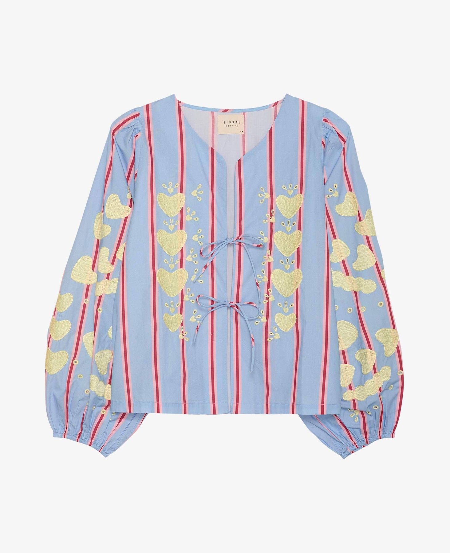 Lichtblau top van Sissel Edelbo met rode strepen en groene hartborduursels. De top is gemaakt van 100% biologische katoenpopeline met een open voorkant.
