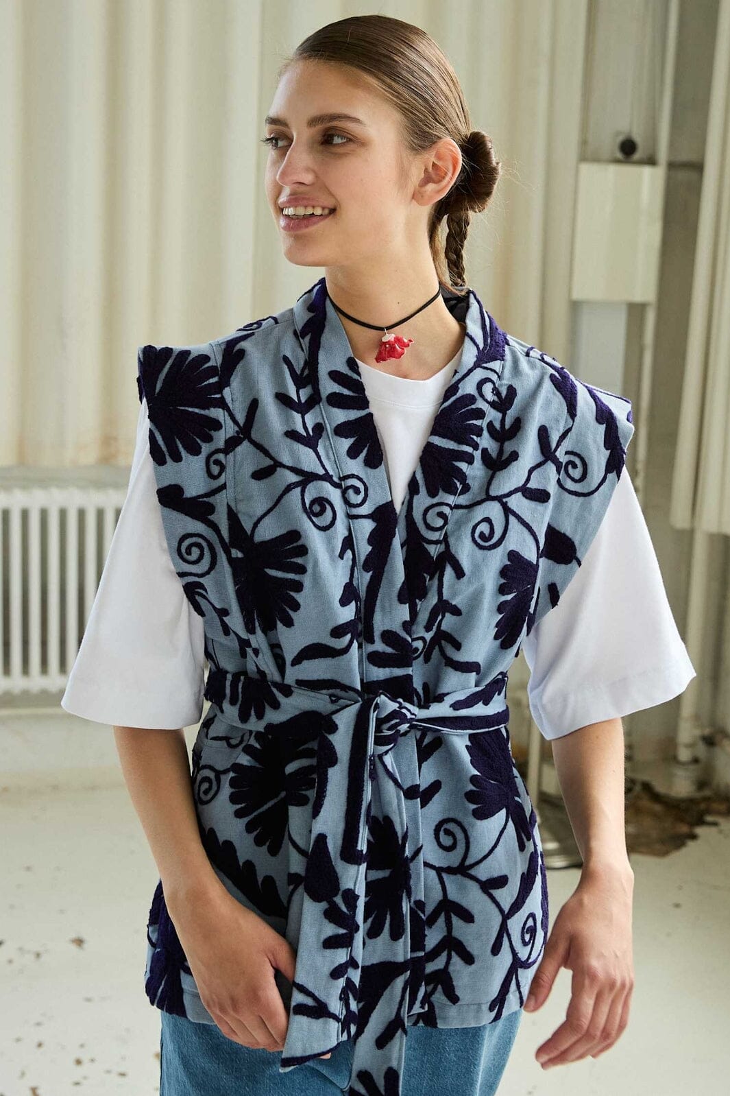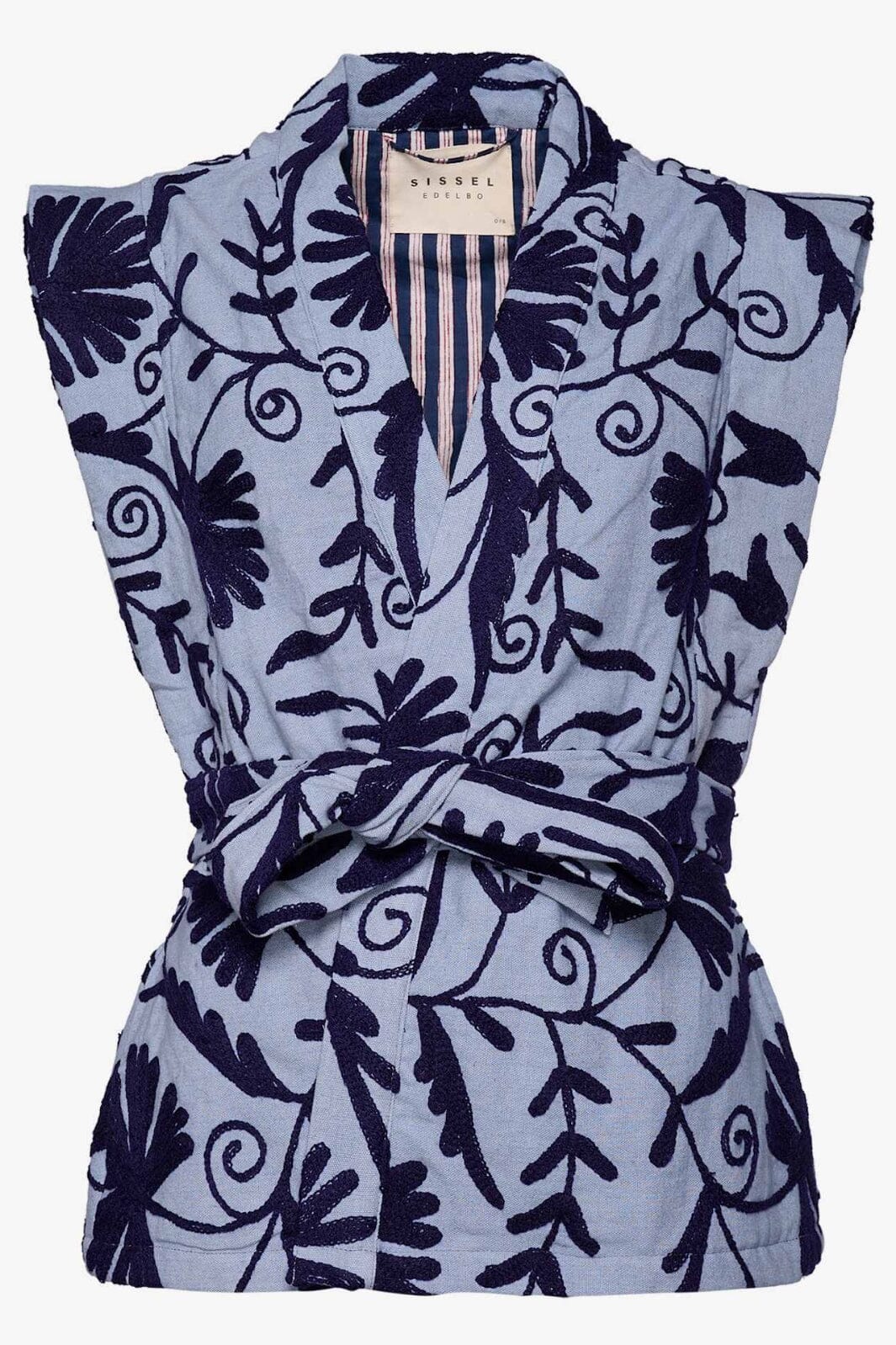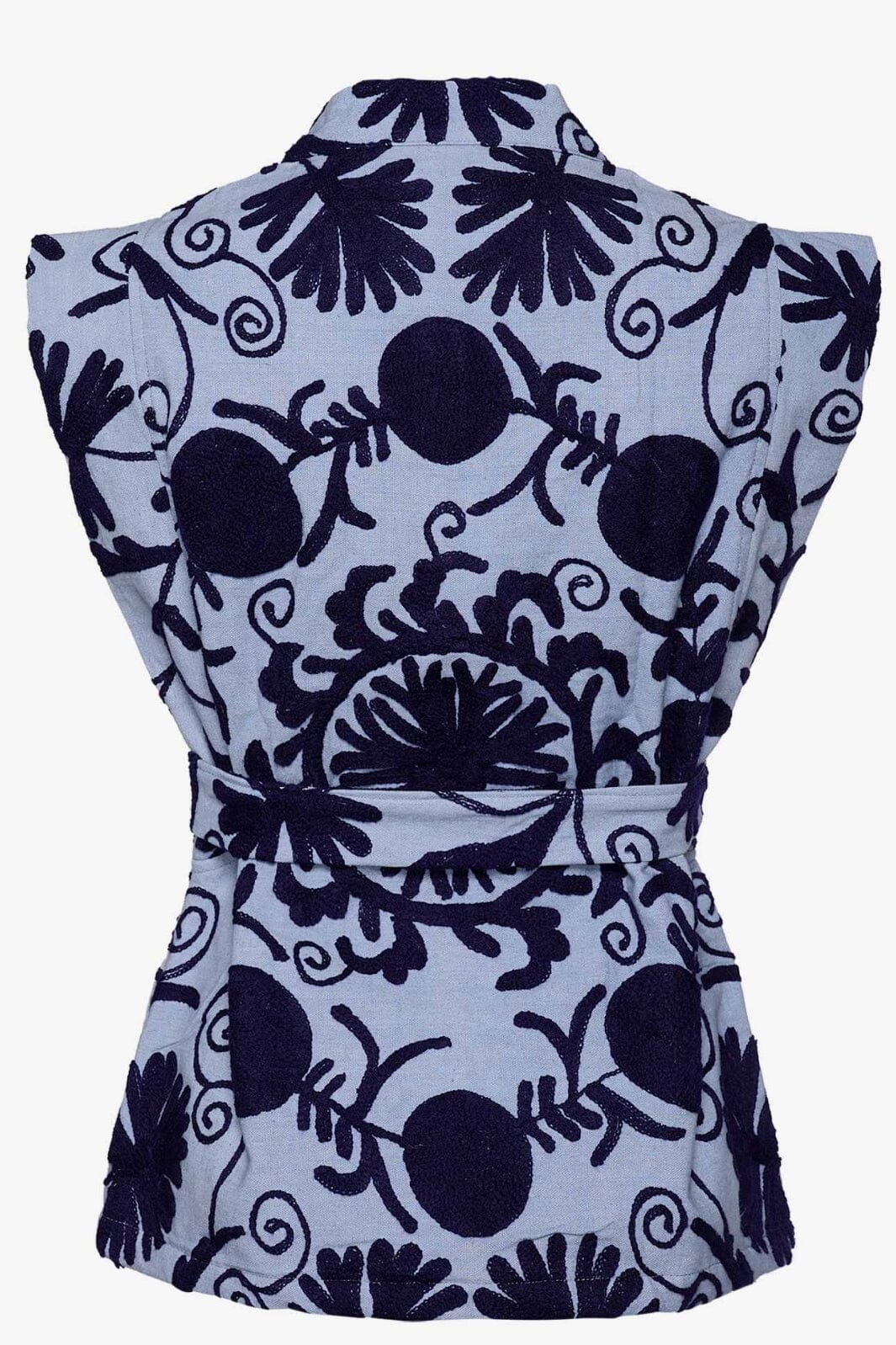 Lichtblau vest van Sissel Edelbo met handgemaakt Suzani- borduurwerk. De vest heeft brede schouders, zijzakken en een afneembare riem. Donkerblauwe bloemenpatronen sieren de hele vest.
