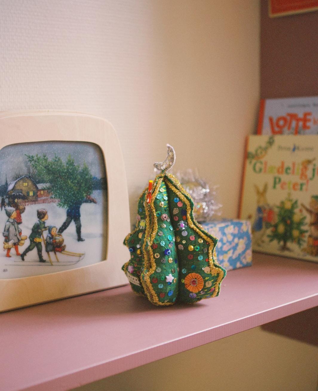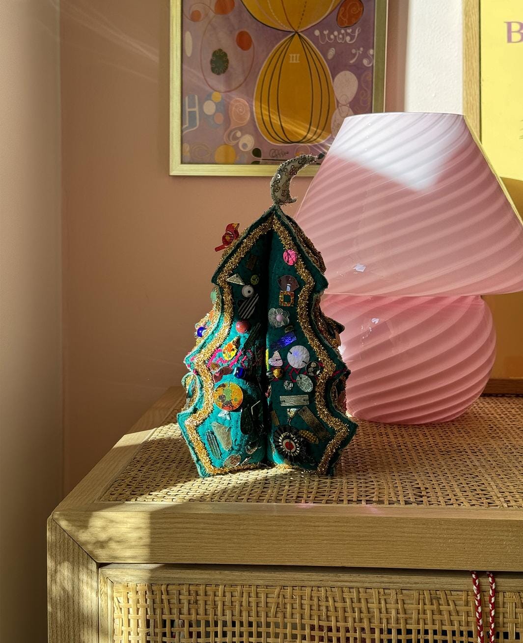 Decoratieve kerstboom van Sissel Edelbo, gemaakt van restjes van vintage kantha-dekens. De boom is groen met gouden en zilveren lurex langs de randen en versierd met Evil Eye-kralen en rozetten.