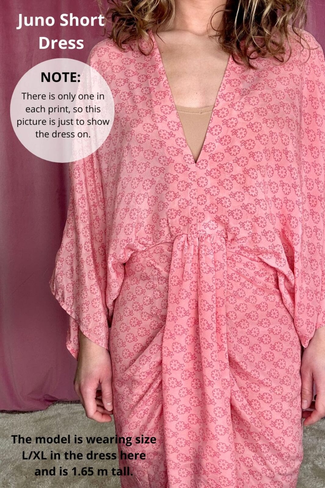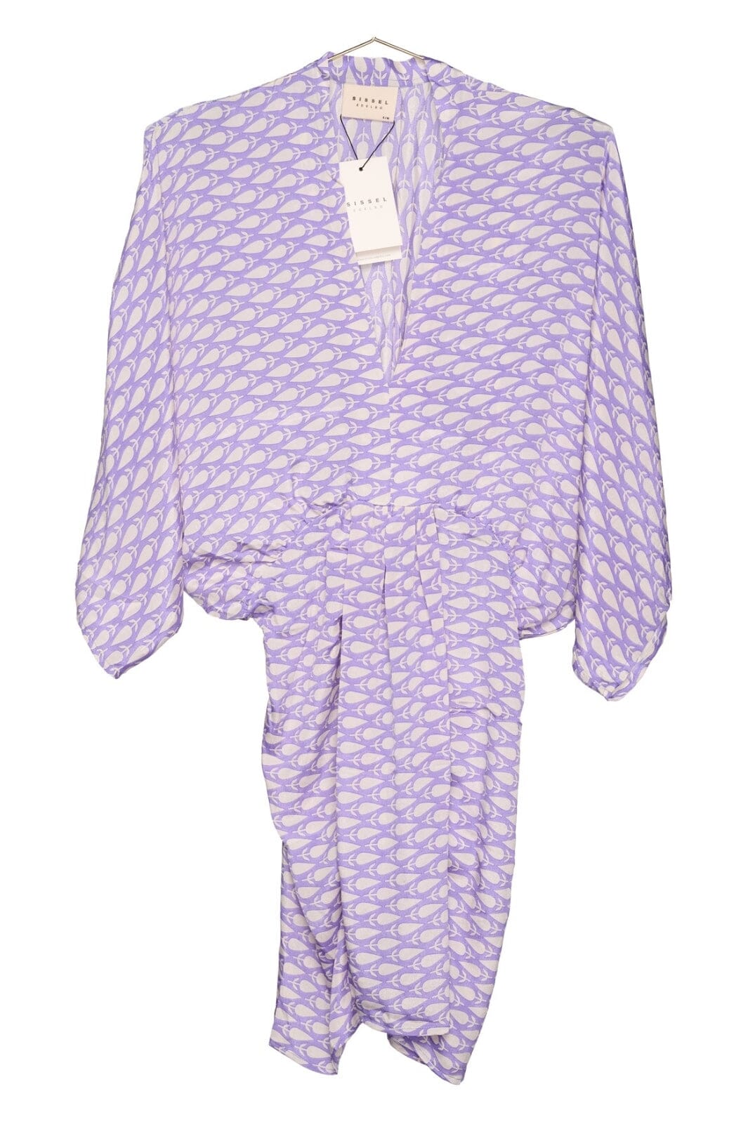 Korte jurk van Sissel Edelbo in een paars en wit print met een V-hals. De jurk heeft vlindermouwen en een elastische taille, die vorm geeft aan het silhouet.