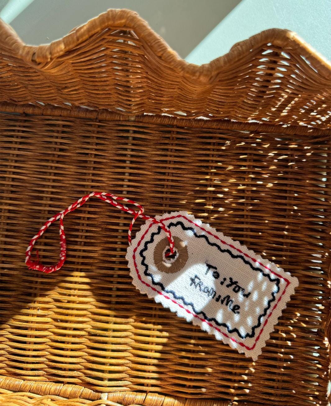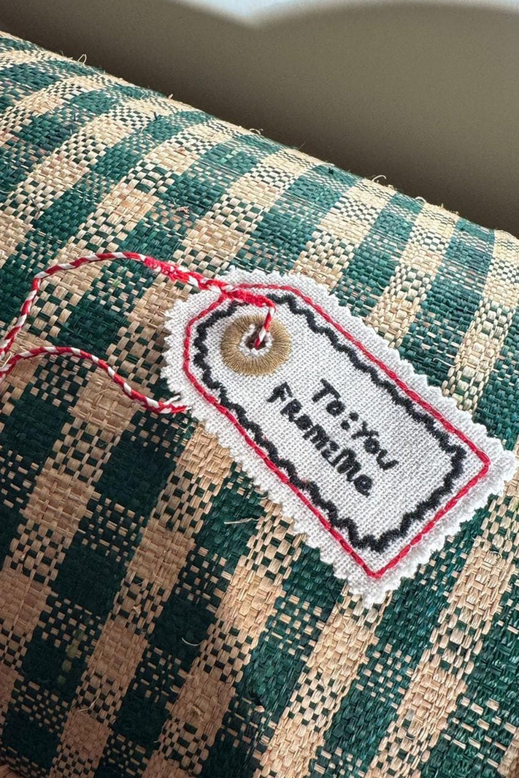 Een dakornament van Sissel Edelbo, gemaakt van overtollige tweed bouclé-stof. Het ornament is rechthoekig met geschulpte randen en een rood/wit gevlochten koord.