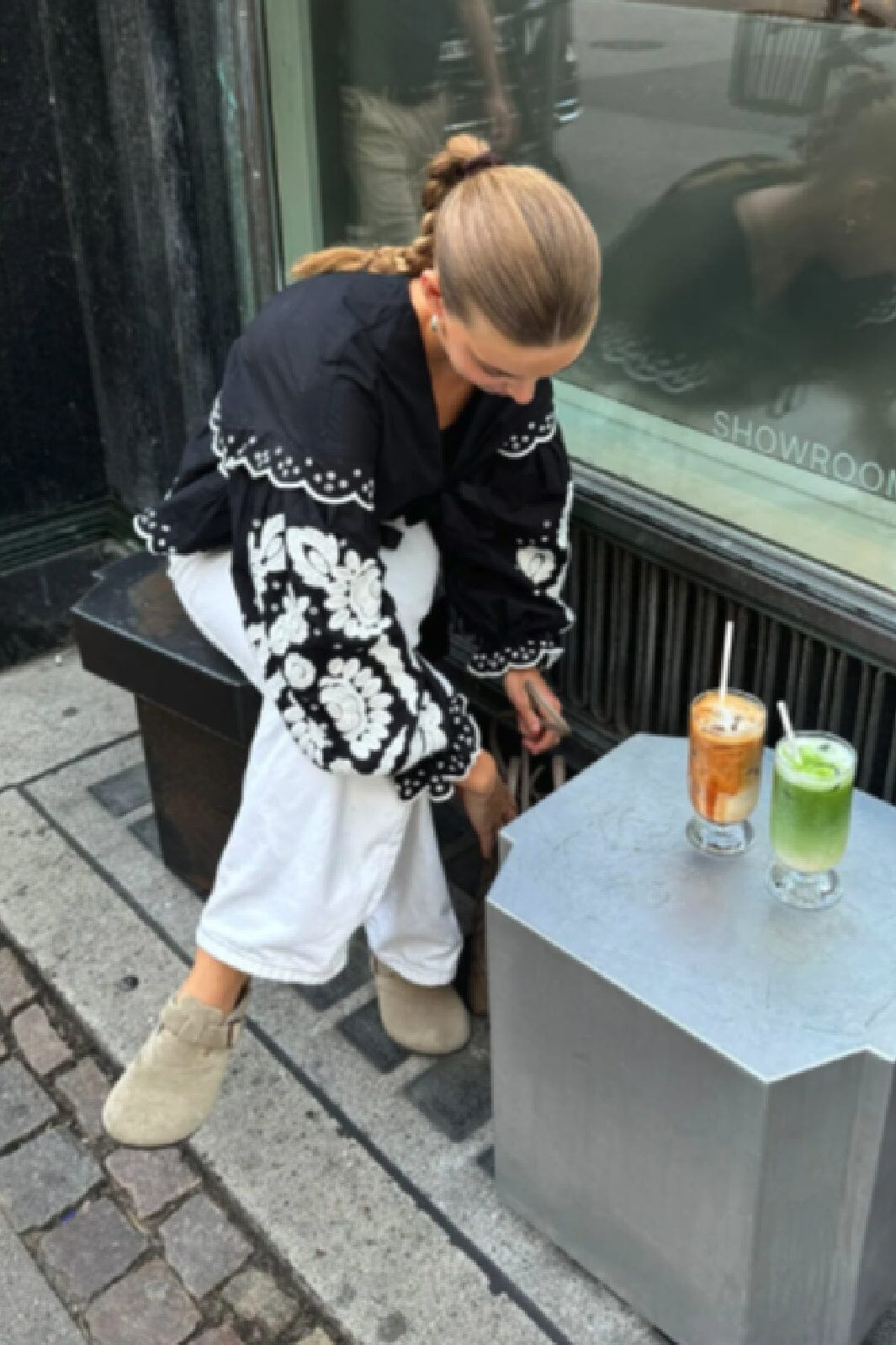 Zwarte top van biologisch katoenpopeline met witte zwanen. De top heeft een V-hals en lange ballonmouwen met geborduurde details langs de randen en op de mouwen.