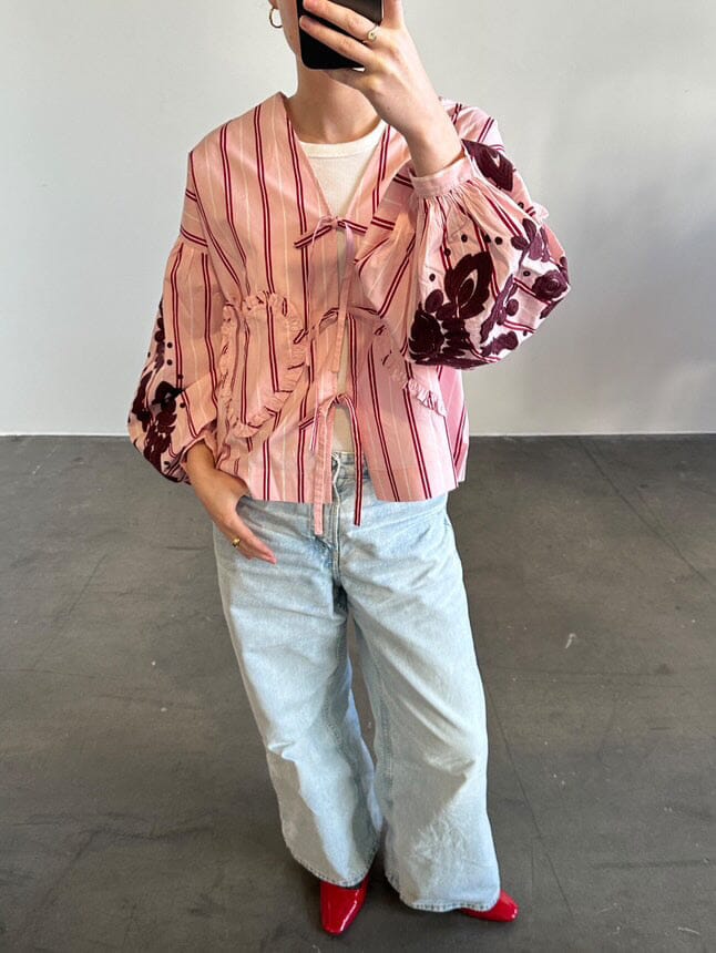 Top van Sissel Edelbo in biologische katoen met roze strepen. Het heeft pofmouwen, hartvormige zakken met ruches en decoratieve zigzagbanden in rood.