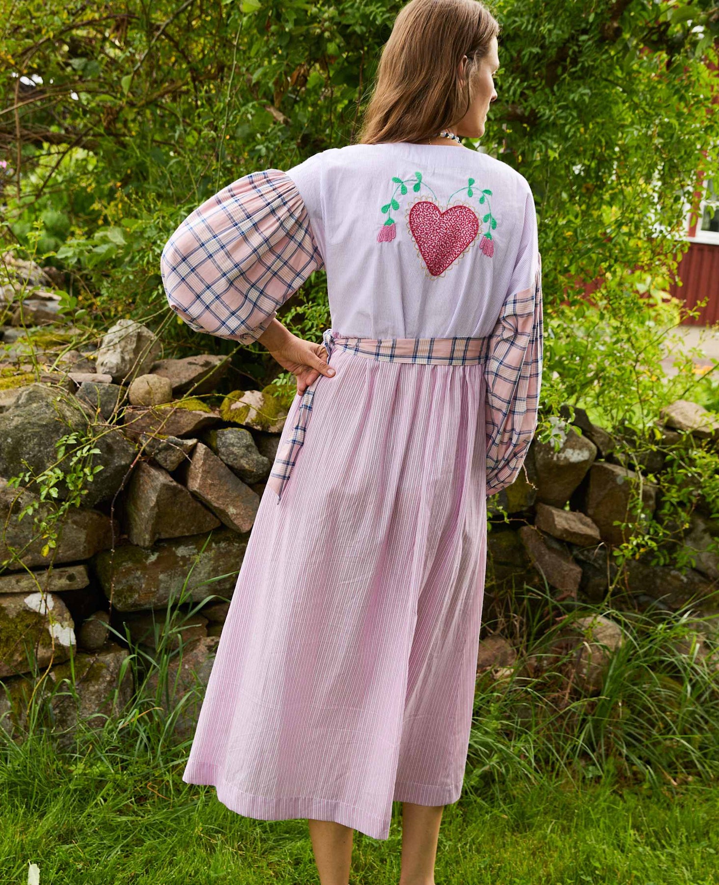 Een wikkeljurk van Sissel Edelbo met een multicolour design in een geruit en gestreept patroon. De jurk is gemaakt van overtollig katoen en deadstock-stoffen.