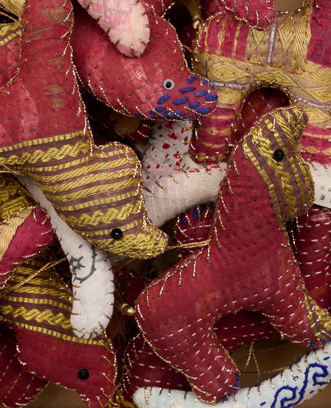Een schommelpaard-decoratie van Sissel Edelbo, gemaakt van restjes van kantha-dekens. De kantha-borduurtechniek hergebruikt oude katoenen sari's en geeft de decoratie zijn handgemaakte uitstraling.