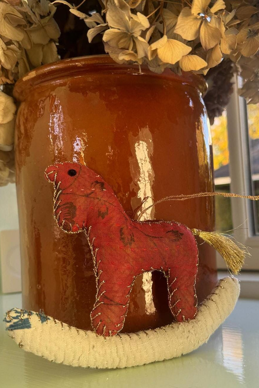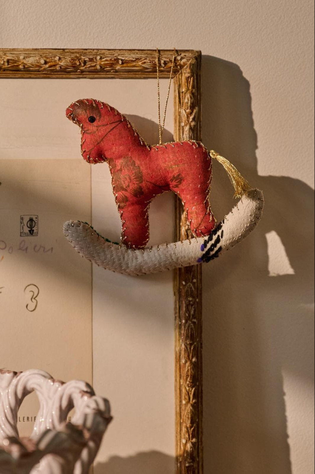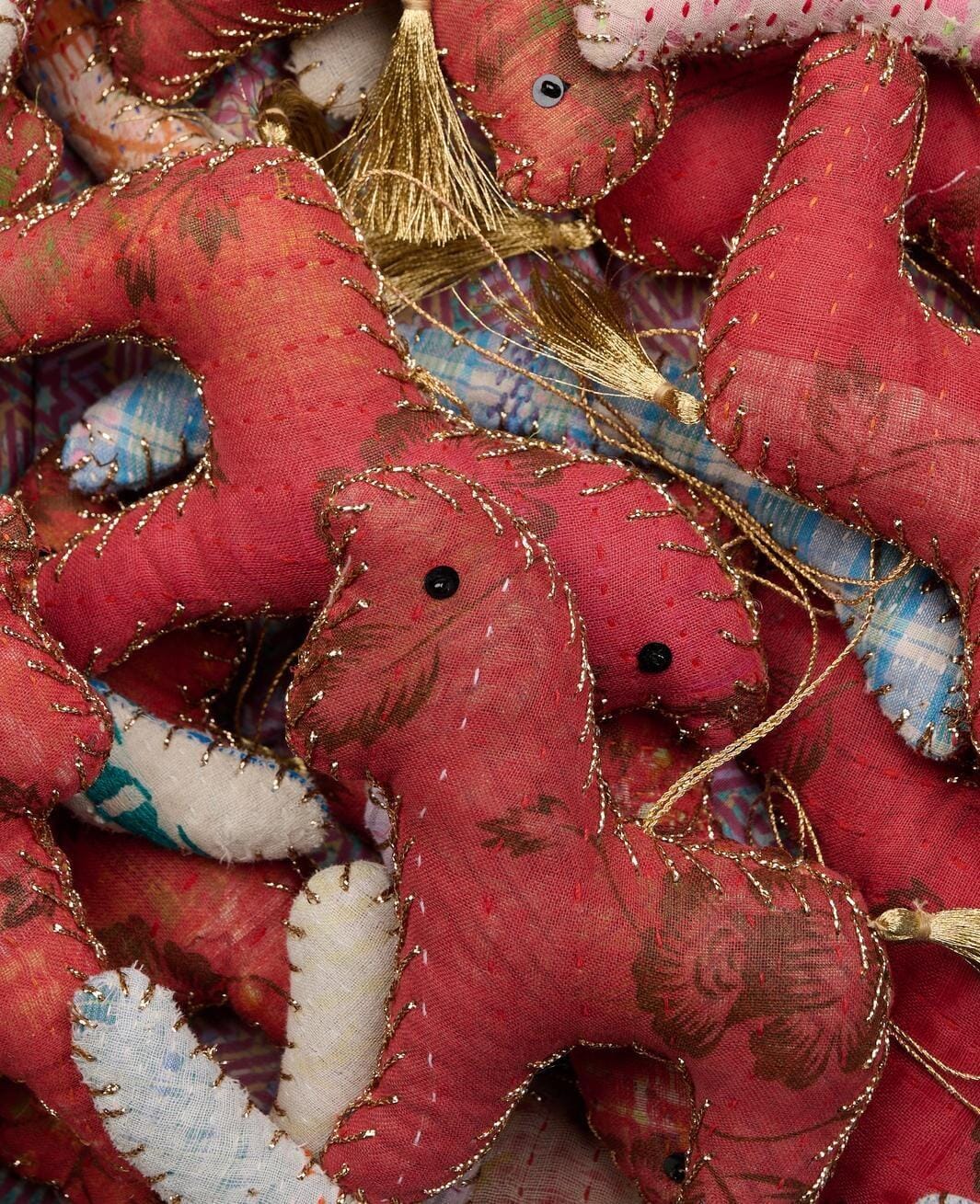 Schommelpaard-ornament van Sissel Edelbo, gemaakt van restjes van kantha-dekens. Elk ornament heeft een rode romp met een witte onderkant en een gouden kwast.