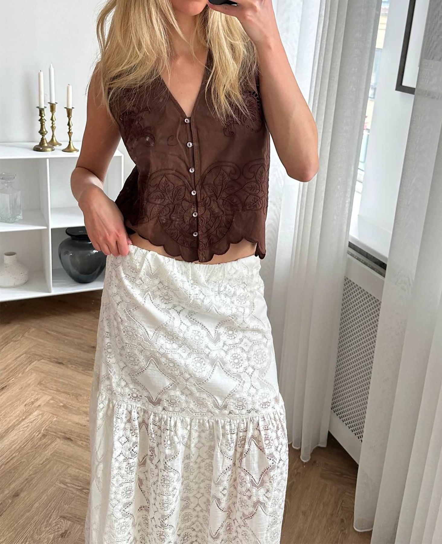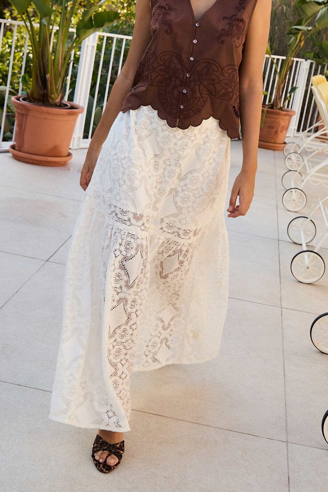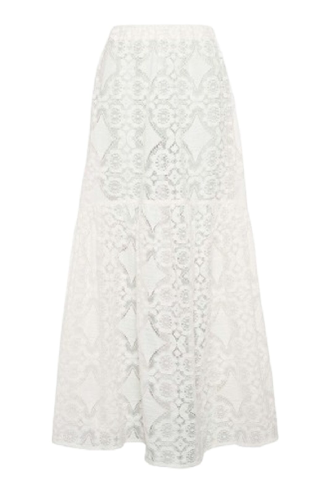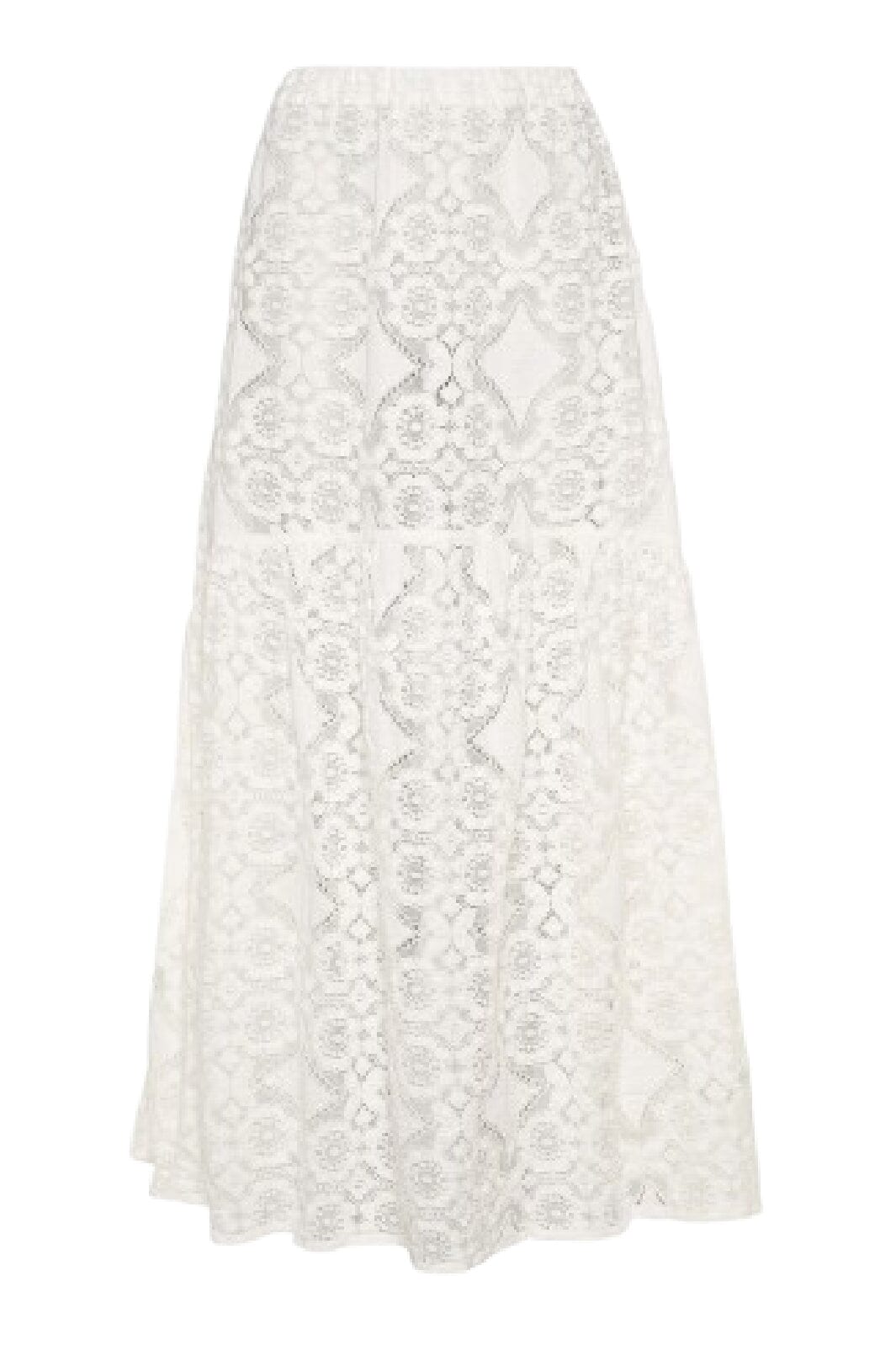Lange rok van Sissel Edelbo in witte broderie anglaise. De rok heeft een losse pasvorm met elastiek in de taille en een gebogen zoom die hem vorm geeft.