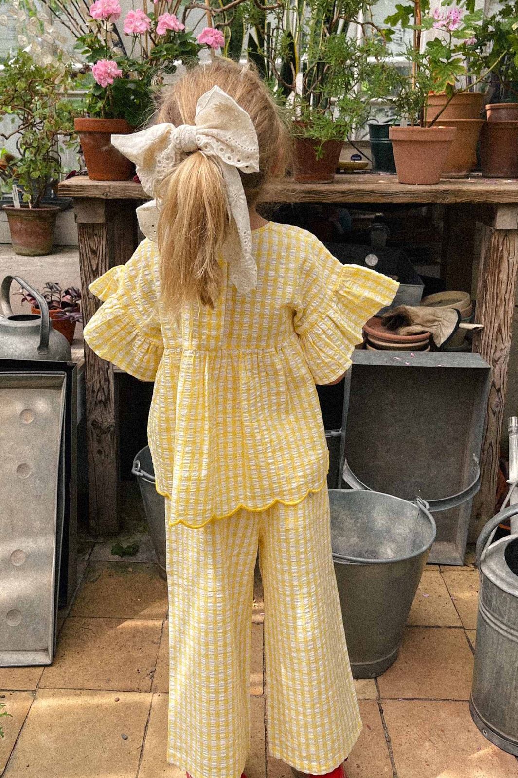 Gele geruite broeken van Sissel Edelbo in biologisch katoen. De broeken hebben een losse pasvorm met elastiek in de taille en een fijn klein blauw gestreept hartdetail op de achterzak.