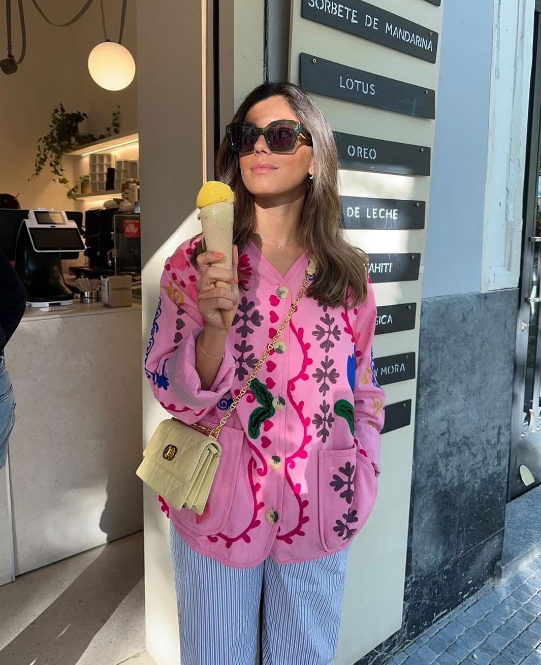 Roze jas van Sissel Edelbo met geborduurde bloemen- en natuurelementen. De jas heeft een losse pasvorm met twee voorzakken en een knoopsluiting aan de voorkant.