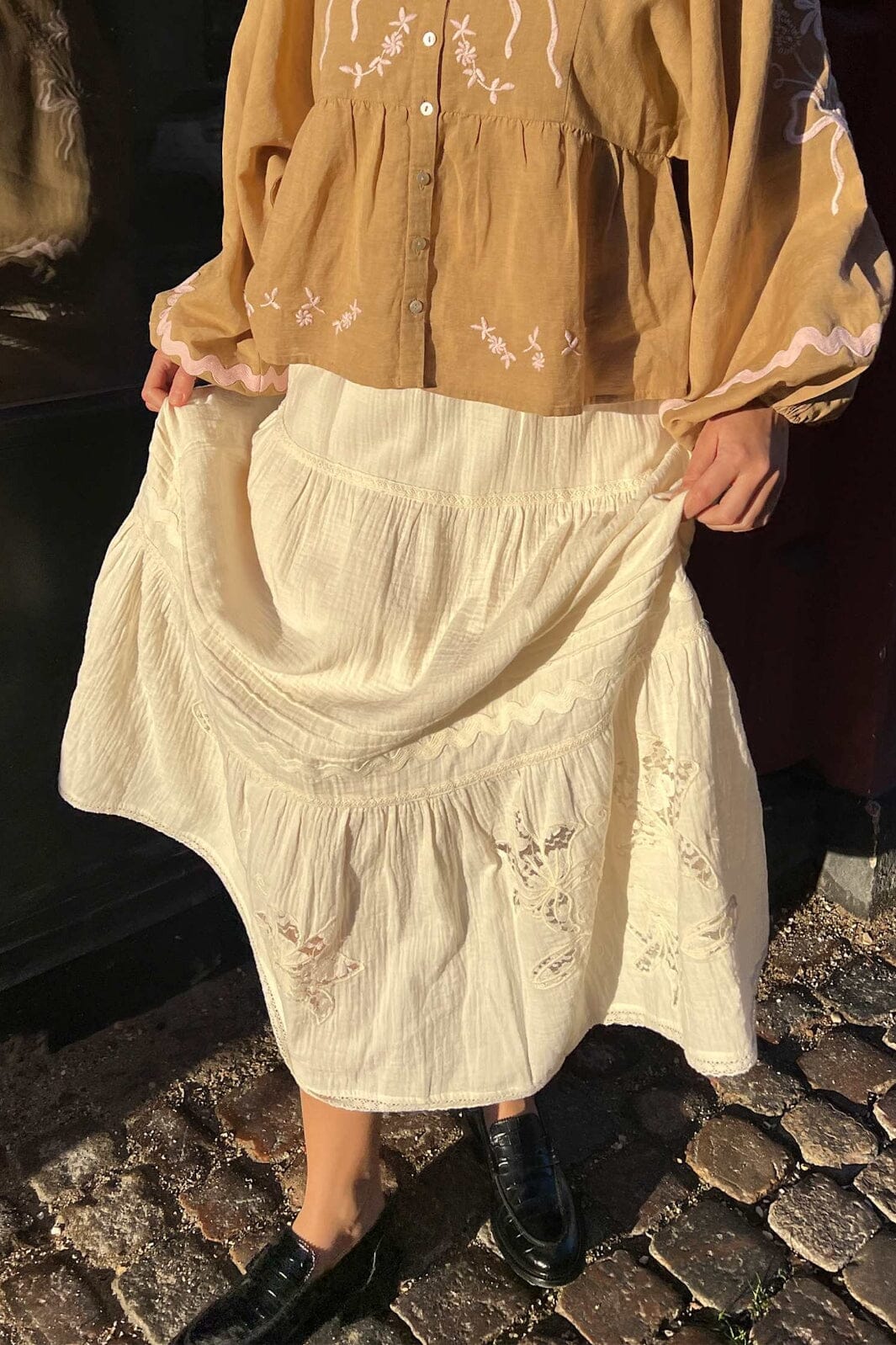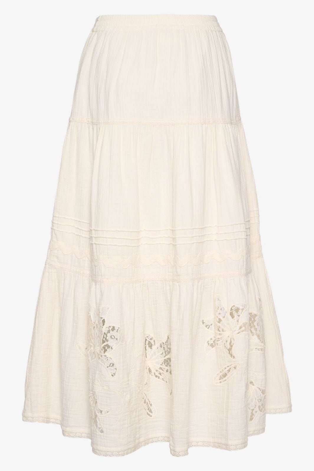 Lange rok van Sissel Edelbo in off-white double gauze-stof. Hij heeft tone-on-tone borduurwerk, kant en ruches, evenals een brede elastische tailleband.