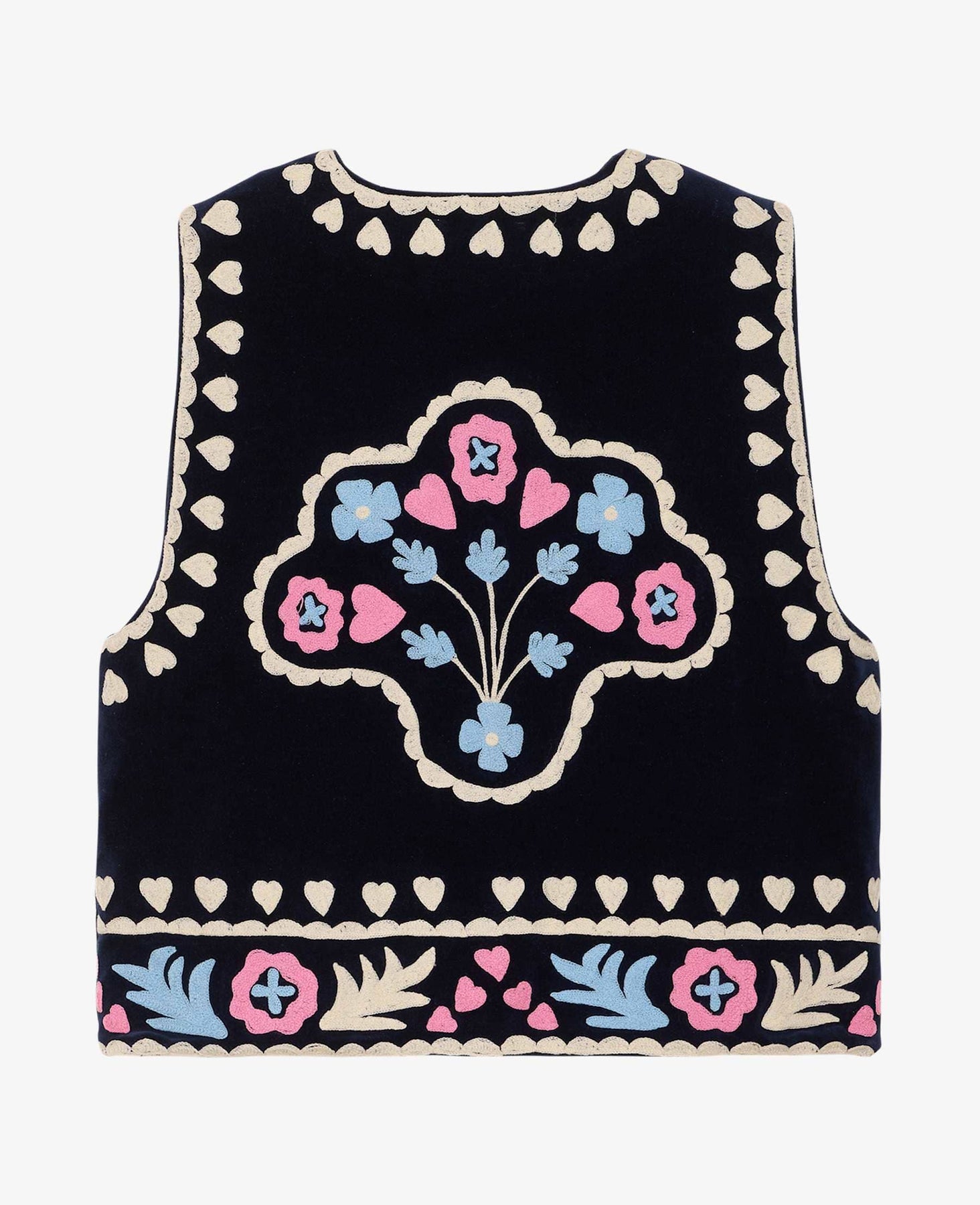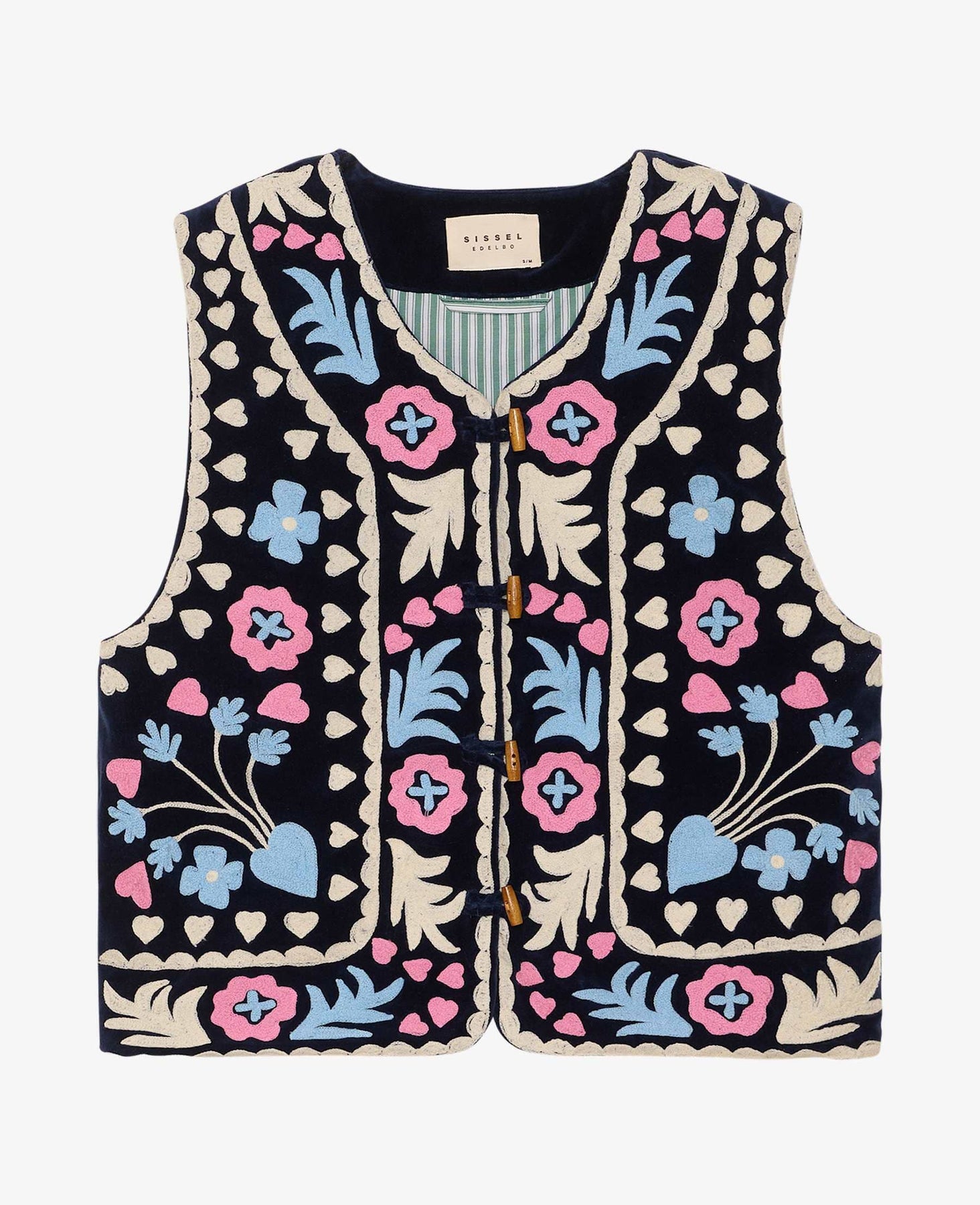 Donkerblauw gilet van Sissel Edelbo met Suzani-borduurwerk in bloemendesign. Gemaakt van overtollig velourskatoen en gevoerd met gestreept katoen.