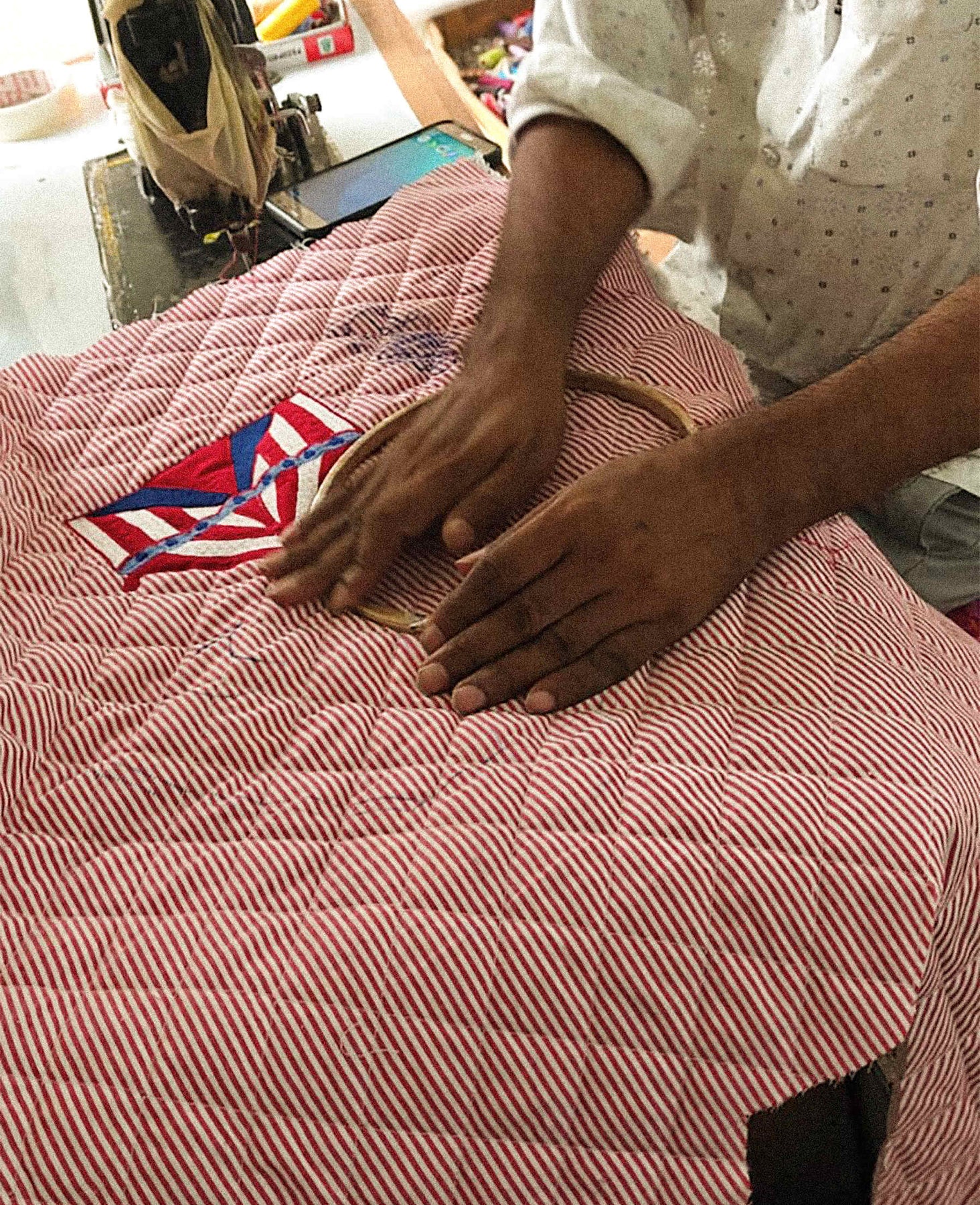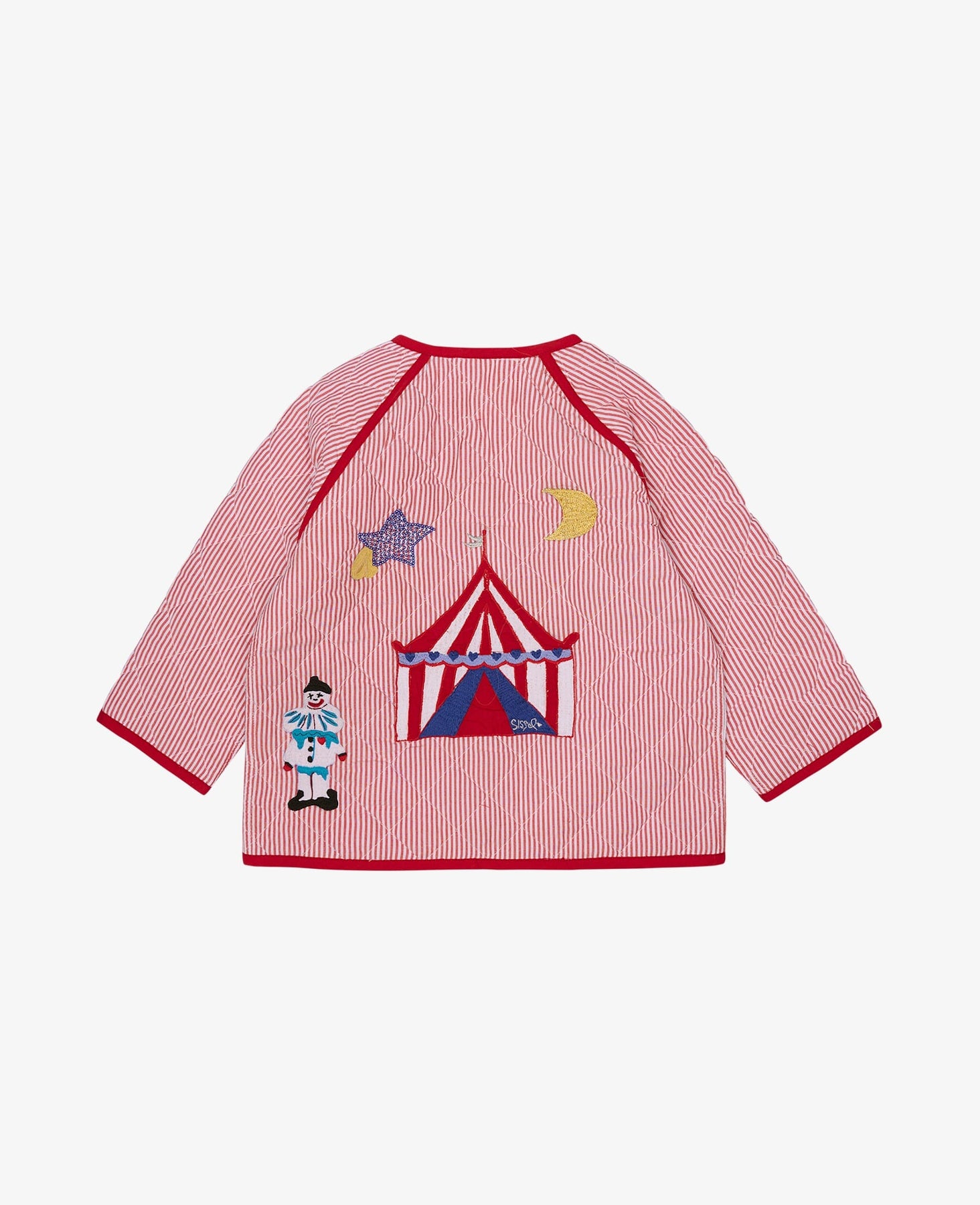 Gewatteerde jas in rood-wit gestreepte katoen met circusthema's. Het ontwerp heeft handgemaakte details met borduurwerk, kralen en pailletten, wat de jas een artistieke uitstraling geeft.