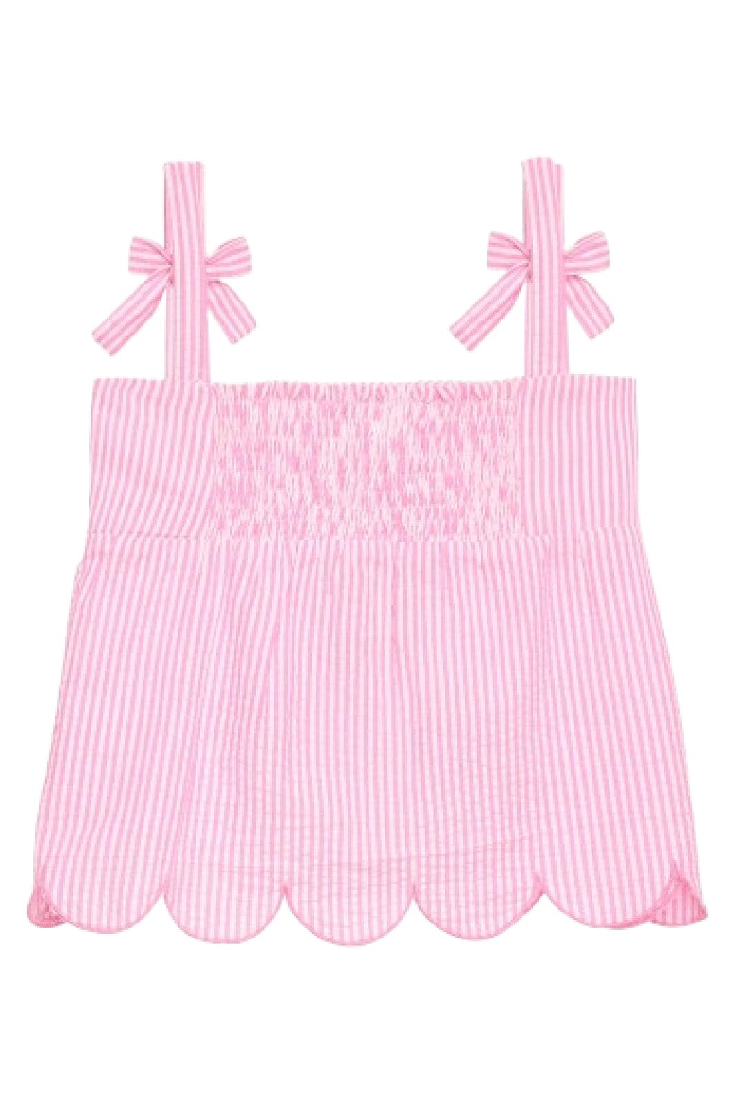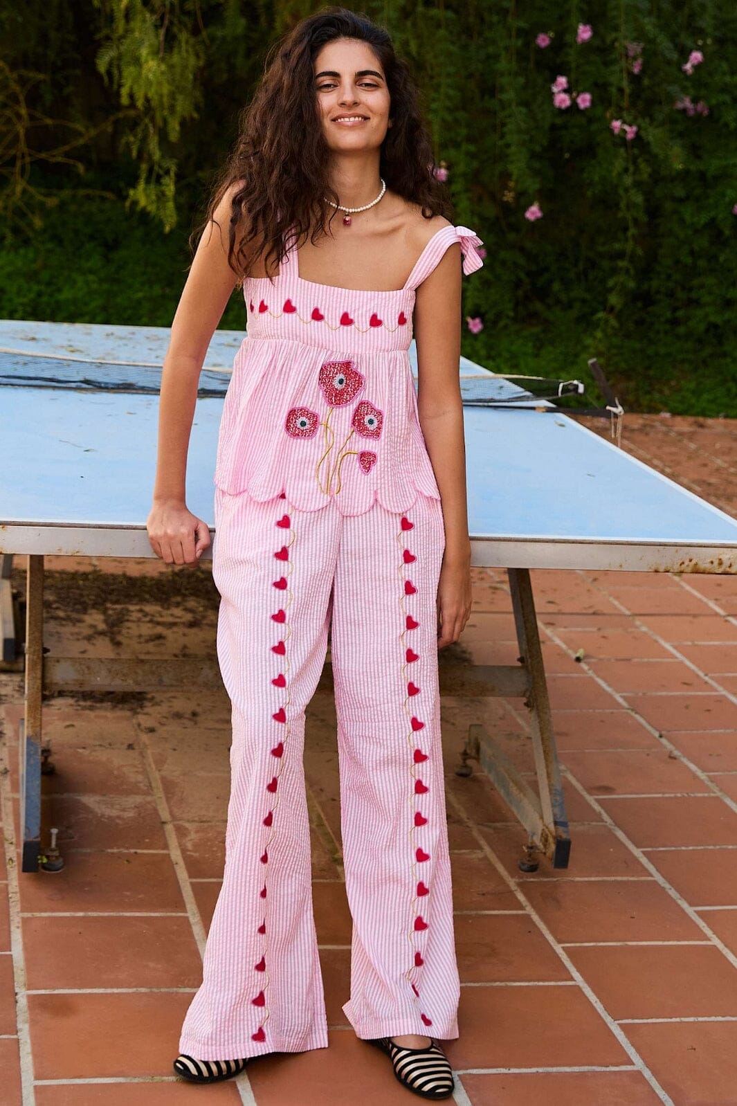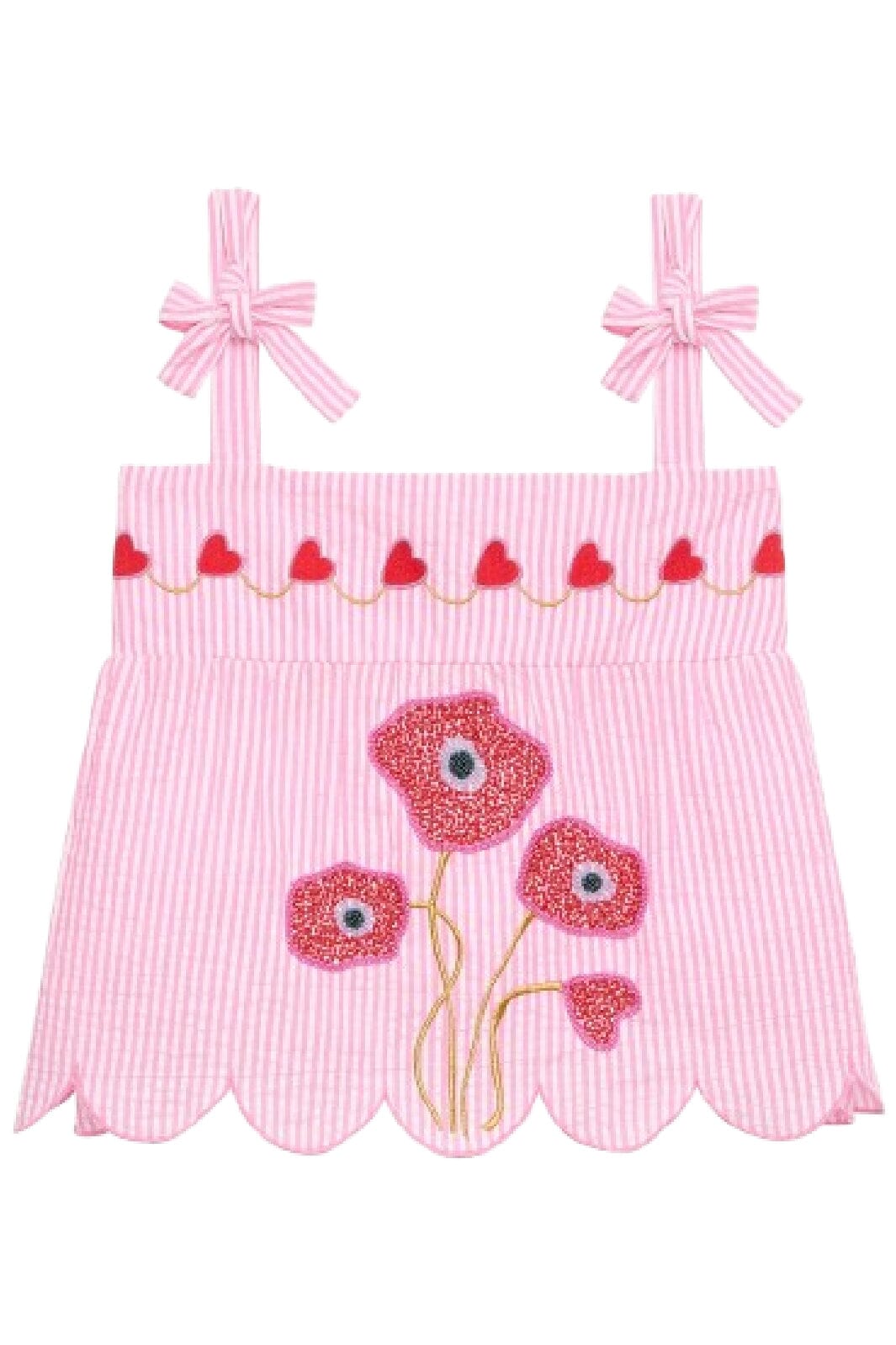 Top van Sissel Edelbo in gestreept seersucker-stof met roze en witte strepen. Het heeft geborduurde bloemen en harten langs de rand en strikdetails op de bandjes.