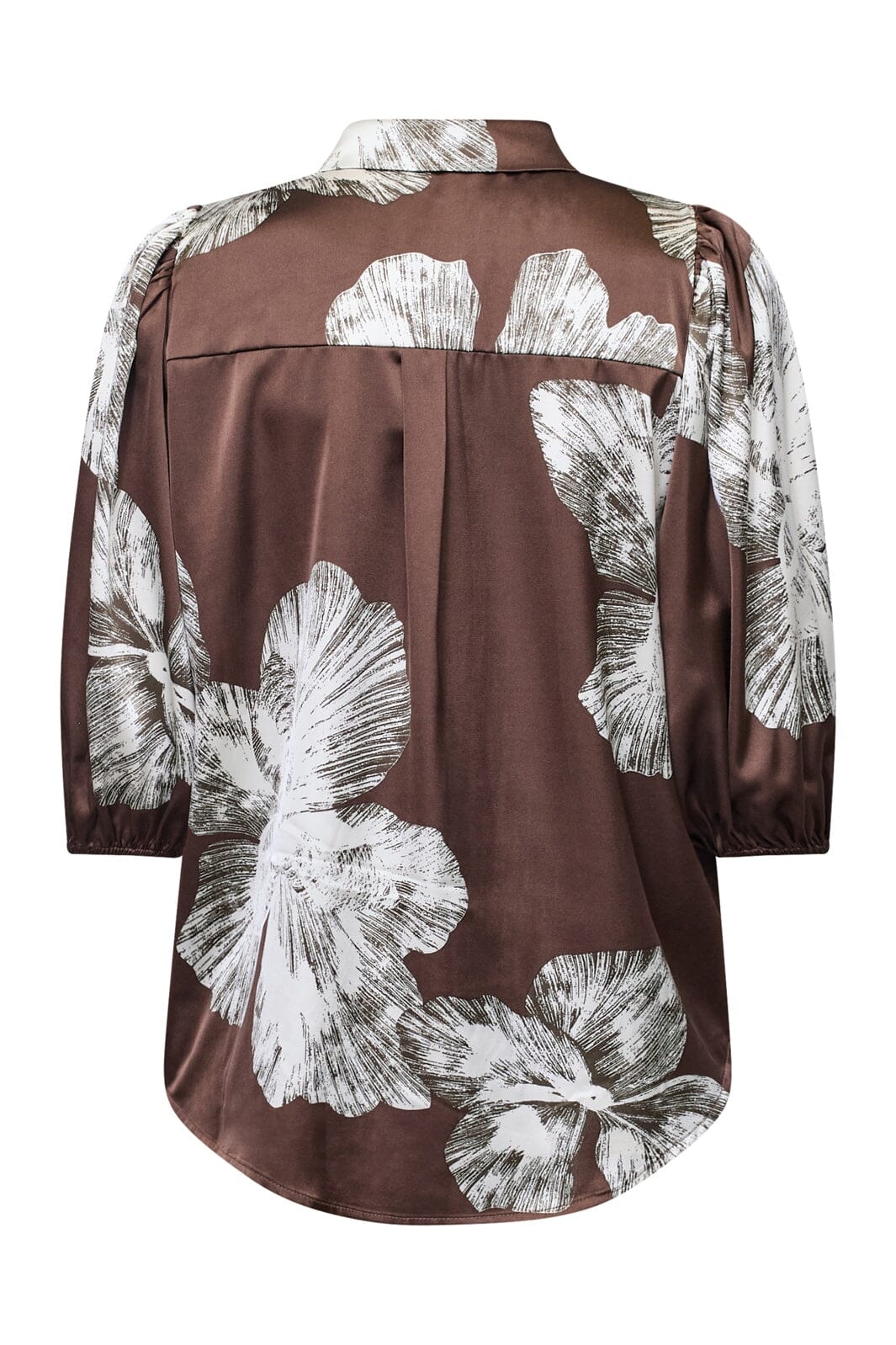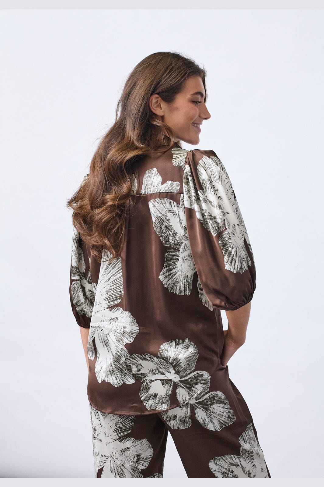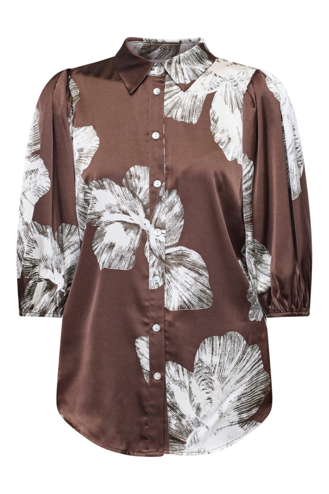 Blouse van Sisters Point in bruine satijn met een grafische bloemenprint in witte tinten. De blouse heeft een klassieke kraag en knoopsluiting.